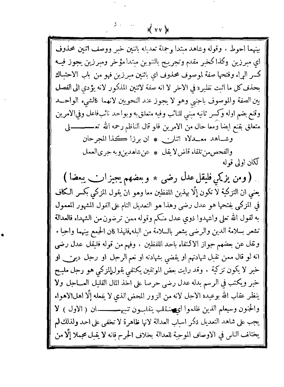 (ومن يزكي فليقل عدل رضى ... وبعضهم يجيزان يبعضا)