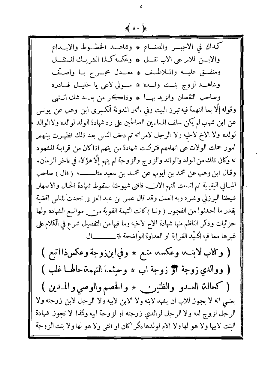 وقوله إلا بما التهمة فيه تبرز البيت وفي آثار المدونة الكبرى ابن وهب عن يونس عن ابن شهاب لم يكن سلف المسلمين الصالحين على رد شهادة الولد لوالده ولا الوالد لولده ولا الأخ لأخيه ولا الرجل لامرأته ثم دخل الناس بعد ذلك فظهرت بينهم أمور حملت الولات على اتهامهم فتكرت شهادة من يتهم إذا كان من قرابة المشهود له وكان ذلك من الولد والوالد والزوج والزوجة لم يتهم إلا هؤلاء في آخر الزمان. وقال ابن وهب عن محمد بن أيوب عن محمد بن سعيد مثله (قال) صاحب المباني اليقينية ثم اتسعت التهم الآن فأفتى شيوخنا بسقوط شهادة الخال والأصهار شيخنا البرزلي وغيره وبه العمل وقد قال عمر بن عبد العزيز تحدث للناس أقضية بقدر ما أحدثوا من الفجور (ولما) كانت التهمة القوية من موانع الشهادة ولها جزئيات وذكر الناظم منها شهادة الأخ لأخيه وما فيها من التفصيل شرع في الكلام على غيرها مما فيه أكيد القرابة أو العداوة الواضحة فقال