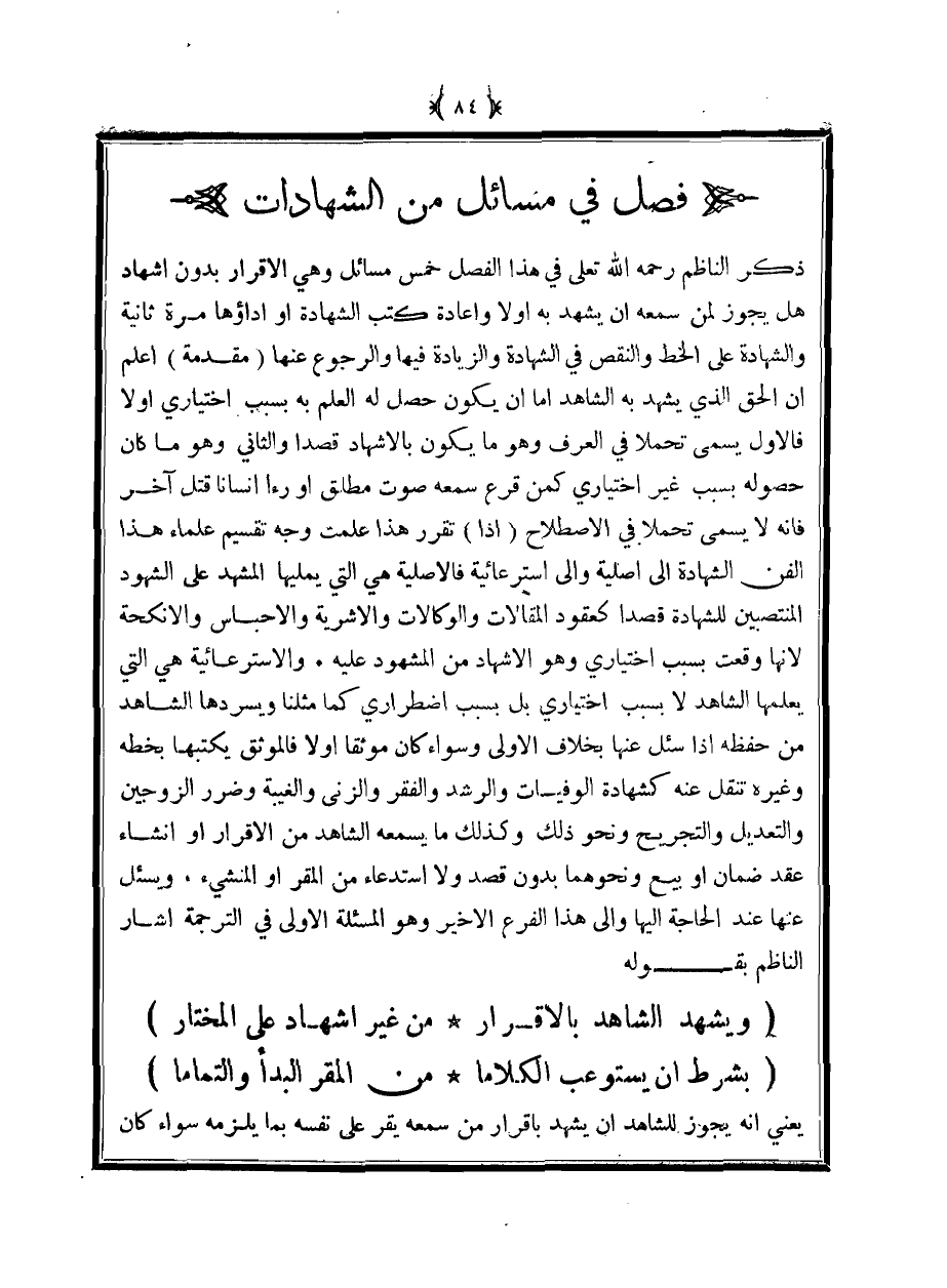 ذكر الناظم رحمه الله تعالى في هذا الفصل خمس مسائل وهي الإقرار بدون إشهاد هل يجوز لمن سمعه أن يشهد به أولًا وإعادة كتب الشهادة أو أداؤها مرة ثانية والشهادة على الخط والنقص في الشهادة والزيادة فيها والرجوع عنها (مقدمة) أعلم أن الحق الذي يشهد به الشاهد أما أن يكون حصل له العلم به بسبب اختياري أولًا فالأول يسمى تحملًا في العرف وهو ما يكون بالإشهاد قصدًا والثاني وهو ما كان حصوله بسبب غير اختياري كمن قرع سمعه صوت مطلق أو رأى إنسانًا قتل آخر فإنه لا يسمي تحملًا في الاصطلاح (إذا) تقرر هذا علمت وجه تقسيم علماء هذا الفن الشهادة إلى أصلية وإلى استرعائية فالأصلية هي التي يمليها المشهد على الشهود المنتصبين للشهادة قصدا كعقود المقالات والوكالات والأشرية والأحباس والأنكحة لأنها وقعت بسبب اختياري وهو الإشهاد من المشهود عليه. والاسترعائية هي التي يعلمها الشاهد لا بسبب اختياري بل بسبب اضطراري كما مثلنا ويسردها الشاهد من حفظه إذا سئل عنها بخلاف الأولى وسواء كان موثقًا أولًا فالموثق يكتبها بخطه وغيره تنقل عن كشهادة الوفيات والرشد والفقر والزنى والغيبة وضرر الزوجين والتعديل والتجريح ونحو ذلك وكذلك ما يسمعه الشاهد من الإقرار أو إنشاء عقد ضمان أو بيع ونحوهما بدون قصد ولا استدعاء من المقر أو المنشيء. ويسئل عنها عند الحاجة إليها وإلى هذا الفرع الأخير وهو المسئلة الأولى في الترجمة أشار الناظم بقوله