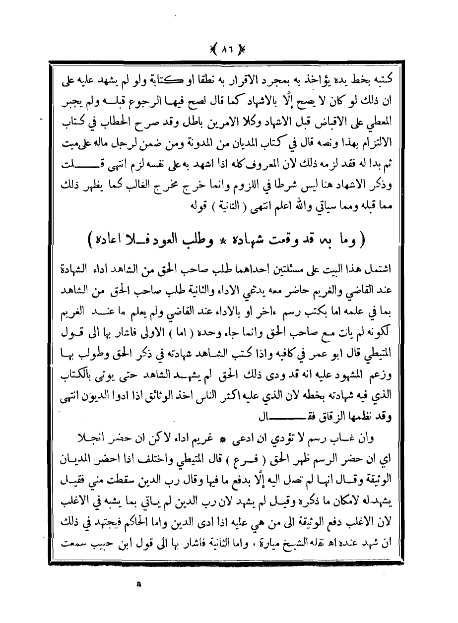 اشتمل هذا البيت على مسئلتين إحداهما طلب صاحب الحق من الشاهد أداء الشهادة عند القاضي والغريم حاضر معه يدعي الآداء والثانية طلب صاحب الحق من الشاهد بما في علمه أما بكتب رسم آخر أو بالآداء عند القاضي ولم يعلم ما عند الغريم لكونه لم يأت مع صاحب الحق وإنما جاء وحده (أما) الأولى فأشار بها إلى قول المتيطي قال أبو عمر في كافيه وإذا كتب الشاهد شهادته في ذكر الحق وطولب بها وزعم المشهود عليه أنه قد ودى وذلك الحق لم يشهد الشاهد حتى يؤتى بالكتاب الذي فيه شهادته بخطه لأن الذي عليه أكثر الناس أخذ الوثائق إذ أدوا الديون انتهى وقد نظمها الزقاق فقال