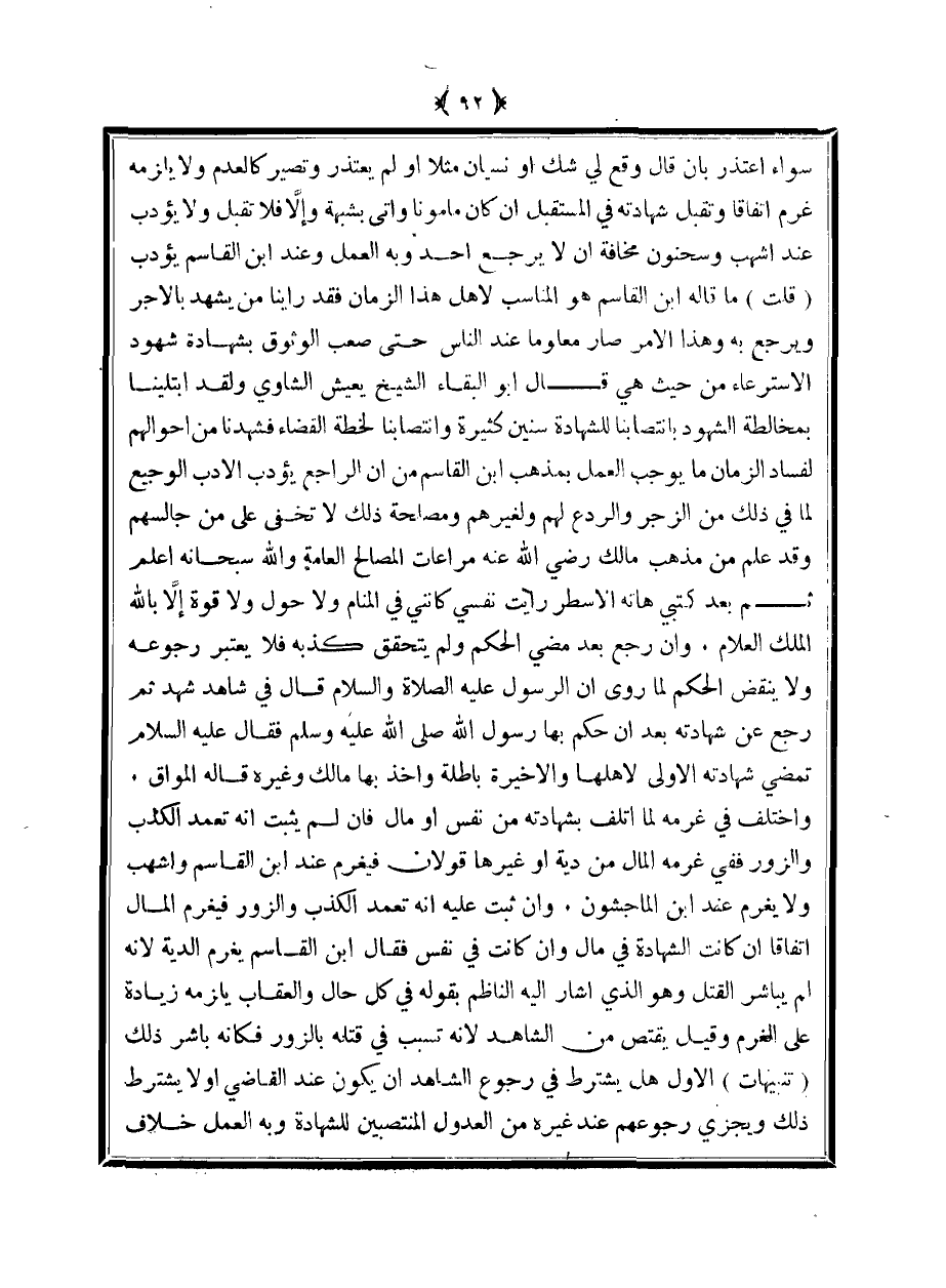 سواء اعتذر بأن قال وقع لي شك أو نسيان مثلًا أو لم يعتذر وتصير كالعدم ولا يلزمه غرم اتفاقًا وتقبل شهادته في المستقبل أن كان مأمونًا وأتى بشبهة وإلا فلا تقبل ولا يؤدب عند أشهب وسحنون مخافة أن لا يرجع أحد وبه العمل وعند ابن القاسم يؤدب (قلت) ما قاله ابن القاسم هو المناسب لأهل هذا الزمان فقد رأينا من يشهد بالأجر ويرجع به وهذا الأمر صار معلومًا عند الناس حتى صعب الوثوق بشهادة شهود الاسترعاء من حيث هي قال أبو البقاء الشيخ يعيش الشاوي ولقد ابتلينا بمخالطة الشهود بانتصابنا للشهادة سنين كثيرة وانتصابنا لخطة القضاء فشهدنا من أحوالهم لفساد الزمان ما يوجب العمل بمذهب ابن القاسم من أن الراجع يؤدب الأدب الوجيع لما في ذلك من الزجر والردع لهم ولغيرهم ومصلحة ذلك لا تخفى على من جالسهم وقد علم من مذهب مالك رضي الله عنه مراعات المصالح العامة والله سبحانه أعلم ثم بعد كتبي هاته الأسطر رأيت نفسي كأنني في المنام ولا حول ولا قوة إلا بالله الملك العلام. وإن رجع بعد مضي الحكم ولم يتحقق كذبه فلا يعتبر رجوعه ولا ينقض الحكم لما روى أن الرسول عليه الصلاة والسلام قال في شاهد شهد ثم رجع عن شهادته بعد أن حكم بها رسول الله صلى الله عليه وسلم فقال عليه السلام تمضي شهادته الأولى لأهلها والأخيرة باطلة وأخذ بها مالك وغيره قاله المواق. واختلف في غرمه لما أتلف بشهادته من نفس أو مال فإن لم يثبت أنه تعمد الكذب والزور ففي غرمه المال من دية أو غيرها قولان فيغرم عند ابن القاسم وأشهب ولا يغرم عند ابن الماجشون. وإن ثبت عليه أنه تعمد الكذب والزور فيغرم المال اتفاقًا أن كانت الشهادة في مال وإن كانت في نفس فقال ابن القاسم يغرم الدية لأنه لم يباشر القتل وهو الذي أشار إليه الناظم بقوله في كل حال والعقاب يلزمه زيادة على الغرم وقيل يقتص من الشاهد لأنه تسبب في قتله بالزور فكأنه يباشر ذلك (تنبيهات) الأول هل يشترط في رجوع الشاهد أن يكون عند القاضي أو لا يشترط ذلك ويجزي رجوعهم عند غيره من العدول المنتصبين للشهادة وبه العمل خلاف