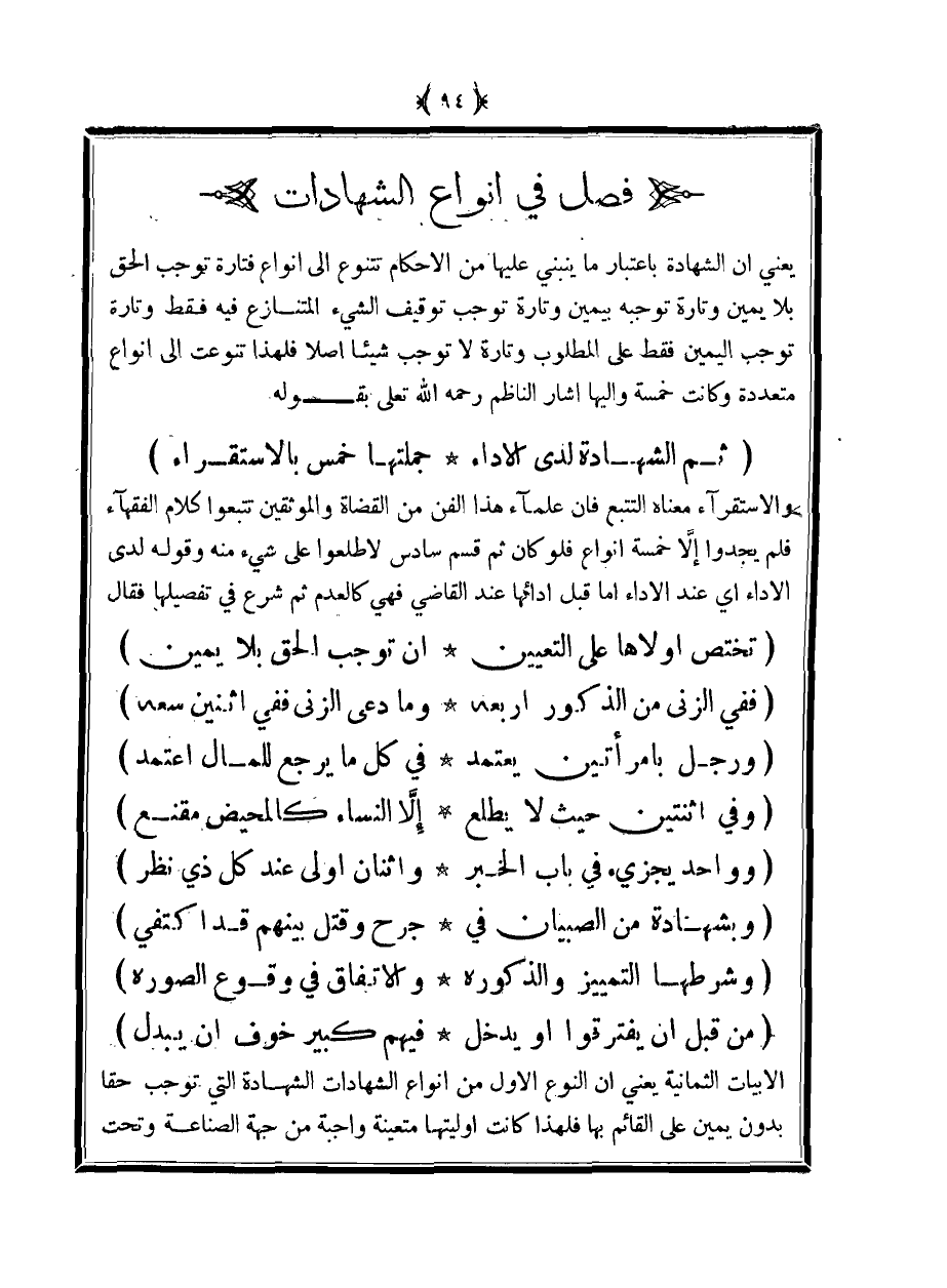 الأبيات الثمانية يعني أن النوع الأول من أنواع الشهادات الشهادة التي توجب حقًا بدون يمين على القائم بها فلهذا كانت أوليتها متعينة واجبة من جهة الصناعة وتحت