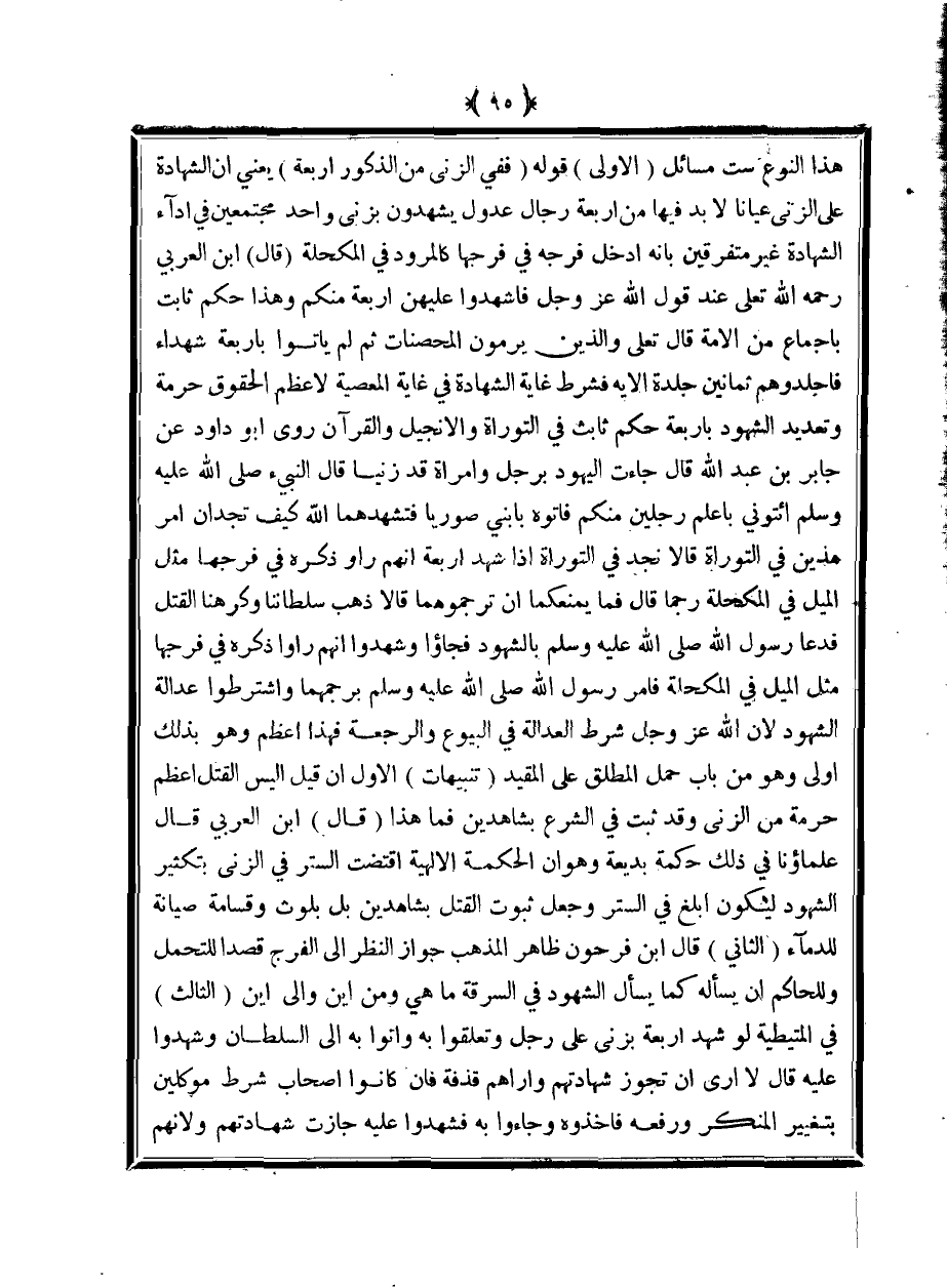 هذا النوع ست مسائل (الأولى) قوله (ففي الزنى من الذكور أربعة) يعني أن الشهادة على الزنى عيانًا لا بد فيها من أربعة رجال عدول يشهدون بزنى واحد مجتمعين في أداء الشهادة غير متفرقين بأنه أدخل فرجه في فرجها كالمرود في المكحلة (قال) ابن العربي رحمه الله تعالى عند قول الله عز وجل {فأشهدوا عليهن أربعة منكم} وهذا حكم ثابت بإجماع من الأمة قال تعالى {والذين يرمون المحصنات ثم لم يأتوا بأربعة شهداء فاجلدوهم ثمانين جلدة} الآية فشرط غاية الشهادة في غاية المعصية لأعظم الحقوق حرمة وتعديد الشهود بأربعة حكم ثابت في التوراة والإنجيل والقرآن روى أبو داود عن جابر بن عبد الله قال جاءت اليهود برجل وامرأة قد زنيا قال النبي صلى الله عليه وسلم ائتوني بأعلم رجلين منكم فأتوه بابني صوريا فتشهدهما الله كيف تجدان أمر هذين في التوراة قالا نجد في التوراة إذا شهد أربعة أنهم رأوا ذكره في فرجها مثل الميل في المكحلة رجما قال فما يمنعكما أن ترجموهما قالا ذهب سلطاننا وكرهنا القتل فدعا رسول الله صلى الله عليه وسلم بالشهود فجاؤوا وشهدوا أنهم رأوا ذكره في فرجها مثل الميل في المحكلة فأمر الرسول صلى الله عليه وسلم برجمهما واشترطوا عدالة الشهود لأن الله عز وجل شرط العدالة في اليبوع والرجعة فهذا أعظم وهو بذلك أولى وهو من باب حمل المطلق على المقيد (تنبيهات) الأول أن قيل أليس القتل أعظم حرمة من الزنى وقد ثبت في الشرع بشاهدين فما هذا (قال) ابن العربي قال علماؤنا في ذلك حكمة بديعة وهو أن الحكمة الإلهية اقتضت الستر في الزنى بتكثير الشهود ليكون أبلغ في الستر وجعل ثبوتت القتل بشاهدين بل بلوث وقسماة صيانة للدماء (الثاني) قال ابن فرحون ظاهر المذهب جواز النظر إلى الفرج قصدا للتحمل وللحاكم أن يسأله كما يسأل الشهود في السرقة ما هي ومن أين وإلى أين (الثالث) في المتيطية لو شهد أربعة بزنى على رجل وتعلقوا به وأتوا به إلى السلطان وشهدوا عليه قال لا أرى أن تجوز شهادتهم وأراهم قذفة فإن كانوا أصحاب شرط موكلين بتغيير المنكر ورفعه فأخذوه وجاءوا به فشهدوا عليه جازت شهادتهم ولأنهم