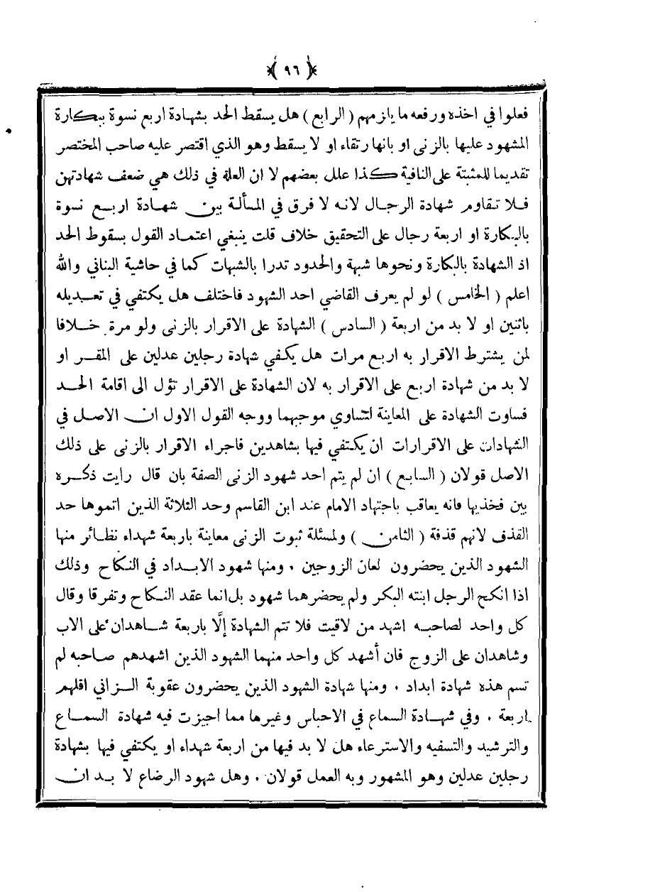 فعلوا في أخذه ورفعه ما يلزمهم (الرابع) هل يسقط الحد بشهادة أربع نسوة ببكارة المشهود عليها بالزنى بأنها ارتقاء أو لا يسقط وهو الذي اقتصر عليه صاحب المختصر تقديمًا للمثبتة على النافية كذا علل بعضهم لا أن العلة في ذلك هي ضعف شهادتهن فلا تقاوم شهادة الرجال لأنه لا فرق في المسألة بين شهادة أربع نسوة بالبكارة أو أربعة رجال على التحقيق خلاف قلت ينبغي اعتماد القول بسقوط الحد إذ الشهادة بالبكارة ونحوها شبهة والحدود تدرأ بالشبهات كما في حاشية البناني والله أعلم (الخامس) لو لم يعرف القاضي أحد الشهود فاختلف هل يكتفي في تعديله باثنين أو لا بد من أربعة (السادس) الشهادة على الإقرار بالزنى ولو مرة خلافًا لمن يشترط الإقرار به أربع مرات هل يكفي شهادة رجلين عدلين على المقر أو لا بد من شهادة أربع على الإقرار به لأن الشهادة على الإقرار تؤول إلى إقامة الحد فساوت الشهادة على المعاينة لتتساوى موجبهما ووجه القول الأول أن الأصل في الشهادات على الإقرارات أن يكتفي فيها بشاهدين فإجراء الإقرار بالزنى على ذلك الأصل قولان (السابع) أن لم يتم أحد شهود الزنى الصفة بأن قال رأيت ذكره بين فخذيها فإنه يعاقب باجتهاد الإمام عند ابن القاسم وحد الثلاثة الذين أتموها حد القذف لأنهم قذفة (الثامن) ولمسألة ثبوت الزنى معاينة بأربعة شهداء نظائر منها الشهود الذين يحضرون لعان الزوجين. ومنها شهود الإبداد في النكاح وذلك إذا أنكح الرجل ابنته البكر ولم يحضرهما شهود بل إنما عقد النكاح وتفرقا وقال كل واحد لصاحبه أشهد من لاقيت فلا تتم الشهادة إلا بأربعة شاهدان على الأرب وشاهدان على الزوج فإن أشهد كل واحد منهما الشهود الذين أشهدهم صاحبه لم تسم هذه شهادة أبداد. ومنها شهادة الشهود الذين يحضرون عقوبة الزاني أقلهم والترشيد والتسفيه والاسترعاء هل لا بد فيها من أربعة شهداء أو يكتفي فيها بشهادة رجلين عدلين وهو المشهور وبه العمل قولان. وهل شهود الرضاع لا بد أن
