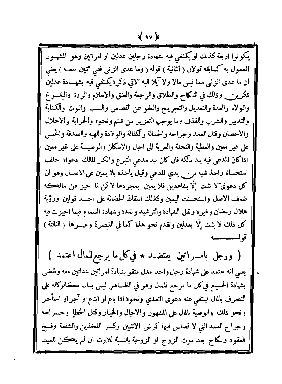 يعني أنه يعتمد على شهادة رجل واحد عدل متقو بشهادة امرأتين عدلتين معه ويقضى بشهادة الجميع في كل ما يرجع للمال وهو في الظاهر ليس بمال كالوكالة على التصرف بالمال لينتفي عنه دعوى التعدي ونحوه إذا باع أو ابتاع أو آجر أو استأجر ونحو ذلك والوصية بالمال على المشهور والآجال والخيار وقتل الخطأ وجراحه وجراح العمد التي لا قصاص فيها كرض الانثيين وكسر الفخذين والشفعة وفسخ العقود ونكاح بعد موت الزوج أو الزوجة بالنسبة للإرث أن لم يكن للميت
