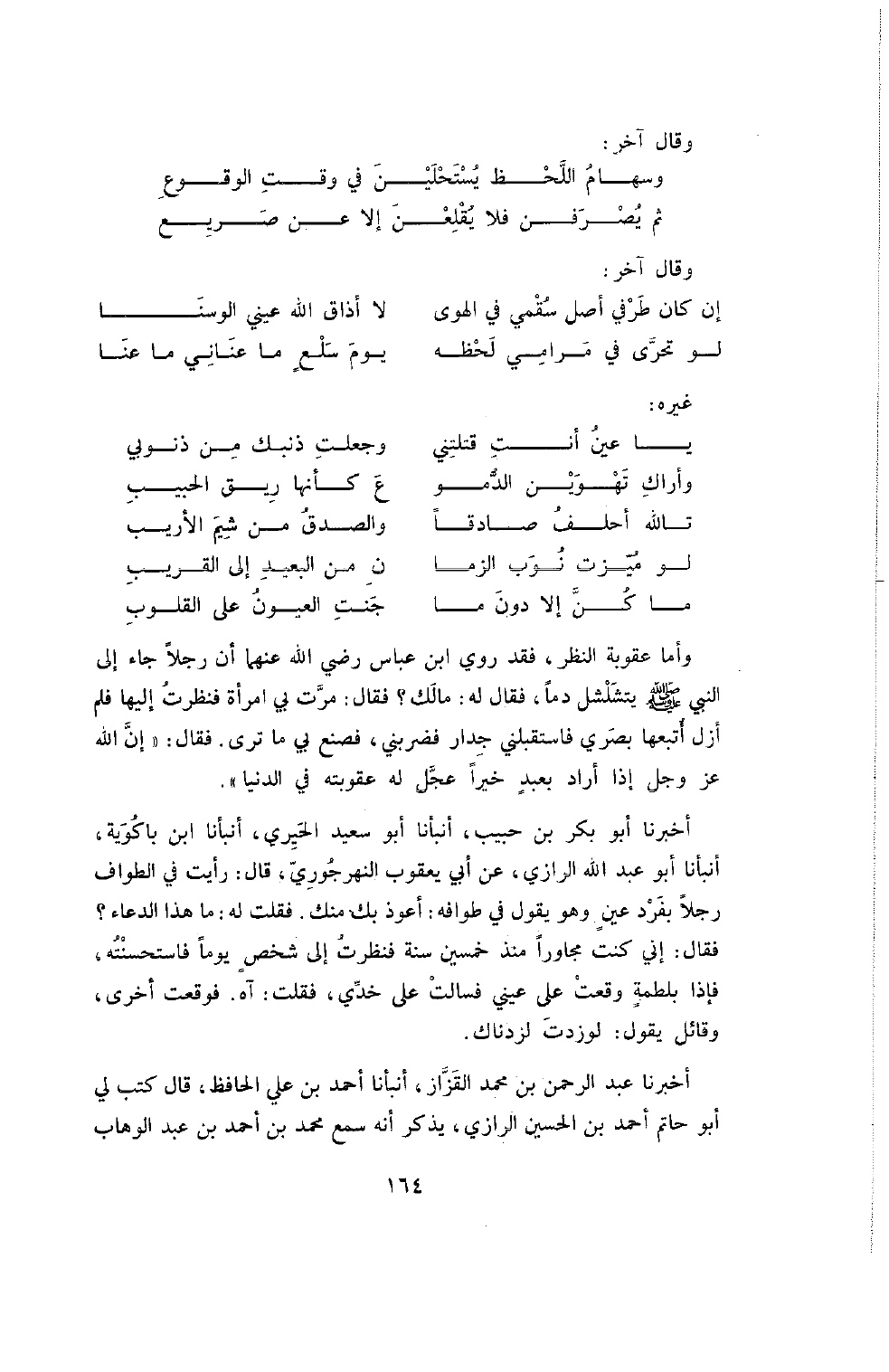 أَخْبَرَنَا أَبُو بَكْرِ بْنُ حَبِيبٍ أَنْبَأَنَا أَبُو سَعِيدٍ الْحَبِيرِيُّ , أَنْبَأَنَا ابْنُ بَاكَوِيَةَ , أَنْبَأَنَا أَبُو عَبْدِ اللَّهِ الرَّازِيُّ، عَنْ أَبِي يَعْقُوبَ النَّهْرَجُورِيِّ , قَالَ: رَأَيْتُ فِي الطَّوَافِ رَجُلا بِفَرْدِ عَيْنٍ وَهُوَ يَقُولُ فِي طَوَافِهِ: أَعُوذُ بِكَ مِنْكَ. فَقُلْتُ لَهُ: مَا هَذَا الدُّعَاءُ؟ فَقَالَ: إِنِّي كُنْتُ مُجَاوِرًا مُنْذُ خَمْسِينَ سَنَةً فَنَظَرْتُ إِلَى شَخْصٍ يَوْمًا فَاسْتَحْسَنْتُهُ , فَإِذَا بِلَطْمَةٍ وَقَعَتْ عَلَى عَيْنِي فَسَالَتْ عَلَى خَدِّي , فَقُلْتُ: آهْ. فَوَقَعَتْ أُخْرَى , وَقَائِلٌ يَقُولُ: لَوْ زِدْتَ لَزِدْنَاكَ.