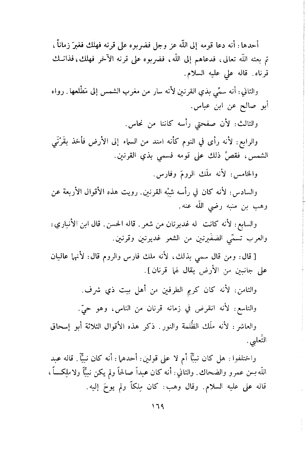 [قَالَ: وَمَنْ قَالَ سُمِّيَ بِذَلِكَ لأَنَّهُ مَلَكَ فَارِسَ وَالرُّومَ قَالَ لأَنَّهُمَا عَالِيَانِ عَلَى جَانِبَيْنِ مِنَ الأَرْضِ يُقَالُ لَهُمَا قَرْنَانِ] وَالثَّامِنُ: لأَنَّهُ كَانَ كَرِيمَ الطَّرَفَيْنِ من أهل البيت ذِي شَرَفٍ. وَالتَّاسِعُ: لأَنَّهُ انْقَرَضَ فِي زَمَانِهِ قَرْنَانِ مِنَ النَّاسِ وَهُوَ حَيٌّ. وَالْعَاشِرُ: لأَنَّهُ مَلَكَ الظُّلْمَةَ وَالنُّورَ: ذَكَرَ هَذِهِ الأَقْوَالَ الثَّلاثَةَ أَبُو إِسْحَاقَ الثَّعْلَبِيُّ.