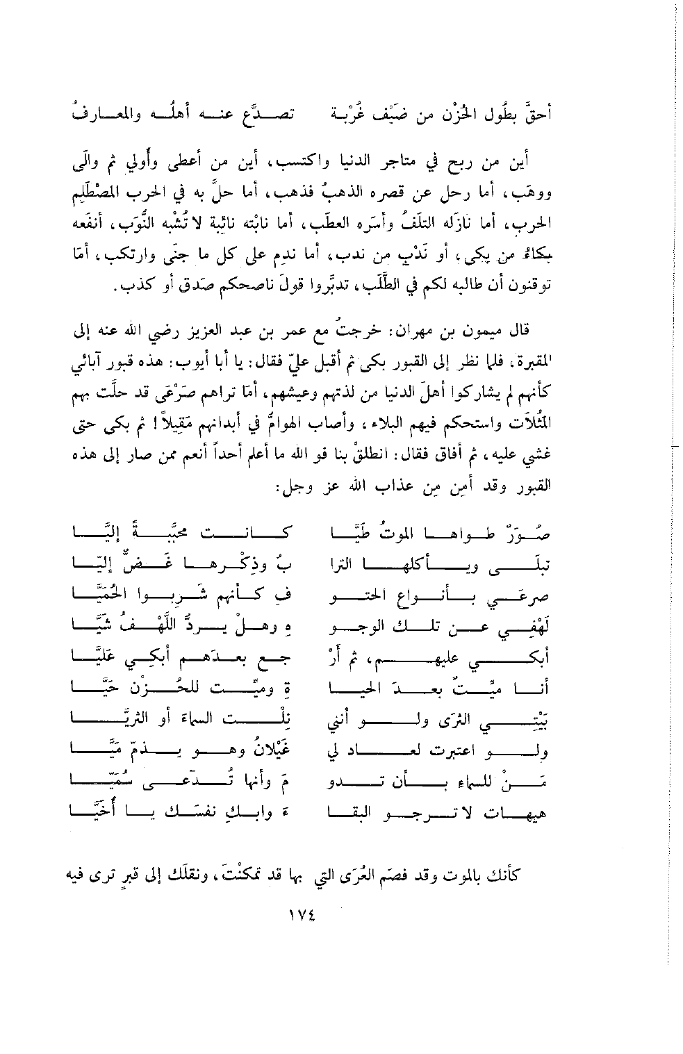 أَيْنَ مَنْ رَبِحَ فِي مَتَاجِرِ الدُّنْيَا وَاكْتَسَبَ , أَيْنَ مَنْ أُعْطِيَ وَأُولِيَ ثُمَّ وَالَى وَوَهَبَ , أَمَا رَحَلَ عَنْ قَصْرِهِ الذَّهَبُ فَذَهَبَ , أَمَا حَلَّ بِهِ فِي الْحَرْبِ الْمُصْطَلِمِ الْحَرَبُ , أَمَا نَازَلَهُ التَّلَفُ وَأَسَرَهُ الْعَطَبُ , أَمَا نَابَتْهُ نَائِبَةٌ لا تُشْبِهُ النُّوَبَ , أَنَفَعَهُ بُكَاءُ مَنْ بَكَى أَوْ نَدْبُ مَنْ نَدَبَ , أَمَا نَدِمَ عَلَى كُلِّ مَا جَنَى وَارْتَكَبَ , أَمَا تُوقِنُونَ أَنَّ طَالِبَهُ لَكُمْ فِي الطَّلَبِ , تَدَبَّرُوا قَوْلَ نَاصِحِكُمْ صَدَقَ أَوْ كَذَبَ.