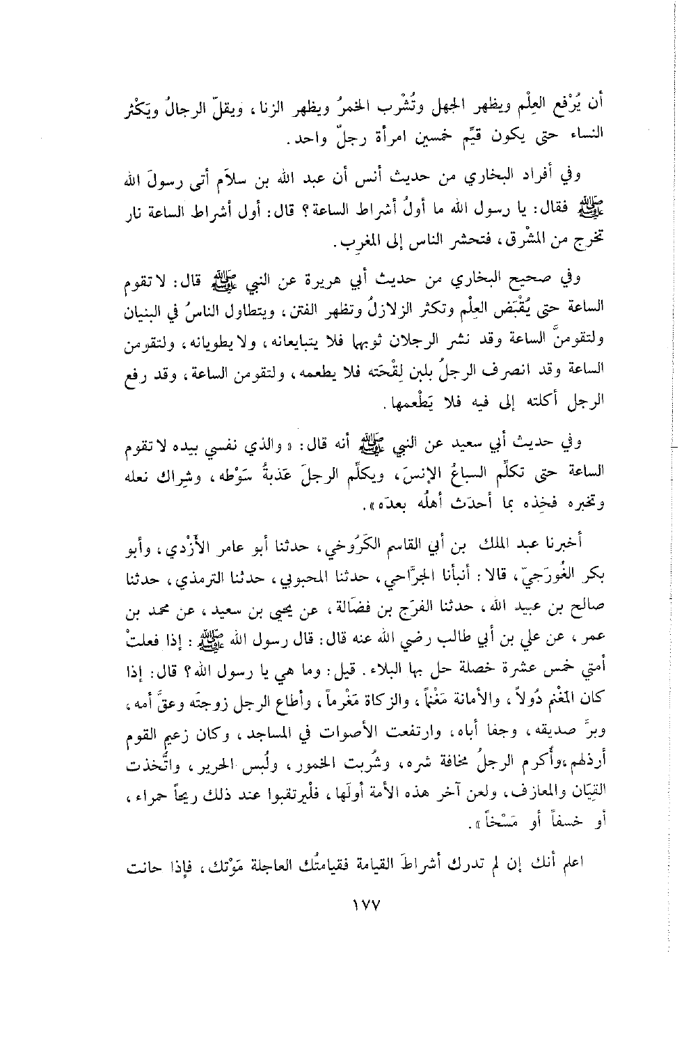 وَفِي صَحِيحِ الْبُخَارِيِّ مِنْ حَدِيثِ أَبِي هُرَيْرَةَ عَنِ النَّبِيِّ صَلَّى اللَّهُ عَلَيْهِ وسلم قال: لا تقوم لساعة حَتَّى يُقْبَضَ الْعِلْمُ وَتَكْثُرَ الزَّلازِلُ وَتْظَهَرَ الْفِتَنُ وَيَتَطَاوَلَ النَّاسُ فِي الْبُنْيَانِ وَلَتَقُومَنَّ السَّاعَةُ وَقَدْ نَشَرَ الرَّجُلانِ ثَوْبَهُمَا فَلا يَتَبَايِعَانِهِ وَلا يَطْوِيَانِهِ , وَلَتَقُومَنَّ السَّاعَةُ وَقَدِ انْصَرَفَ الرَّجُلُ بِلَبَنِ لِقْحَتِهِ فَلا يَطْعَمُهُ، وَلَتَقُومَنَّ السَّاعَةُ وَقَدْ رَفَعَ الرَّجُلُ أُكْلَتَهُ إِلَى فِيهِ فَلا يَطْعَمُهَا.