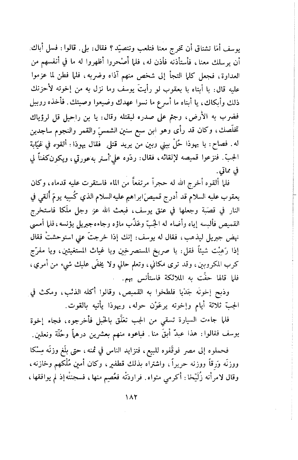 يُوسُفُ أَمَا تَشْتَاقُ أَنْ تَخْرُجَ مَعَنَا فَتَلْعَبَ وَتَتَصَيَّدَ؟ فَقَالَ: بَلَى. قَالُوا: فَسَلْ أَبَاكَ أَنْ يُرْسِلَكَ مَعَنَا , فَاسْتَأْذَنَهُ فَأَذِنَ لَهُ , فَلَمَّا أَصْحَرُوا أَظْهَرُوا لَهُ مَا فِي أَنْفُسِهِمْ مِنَ الْعَدَاوَةِ , فَجَعَلَ كُلَّمَا الْتَجَأَ إِلَى شَخْصٍ مِنْهُمْ آذَاهُ وَضَرَبَهُ , فَلَمَّا فَطِنَ لِمَا عَزَمُوا عَلَيْهِ قَالَ: يا أبتاه يا يعقوب لو رأيت يوسف وما نزل به من إخوته لأحزنك ذلك وأبكاك , يَا أَبَتَاهُ مَا أَسْرَعَ مَا نَسُوا عَهْدَكَ وَضَيَّعُوا وَصِيَّتَكَ. فَأَخَذَهُ روبِيلُ فَضَرَبَ بِهِ الأَرْضَ وجثم على صدره ليقتله وقال: