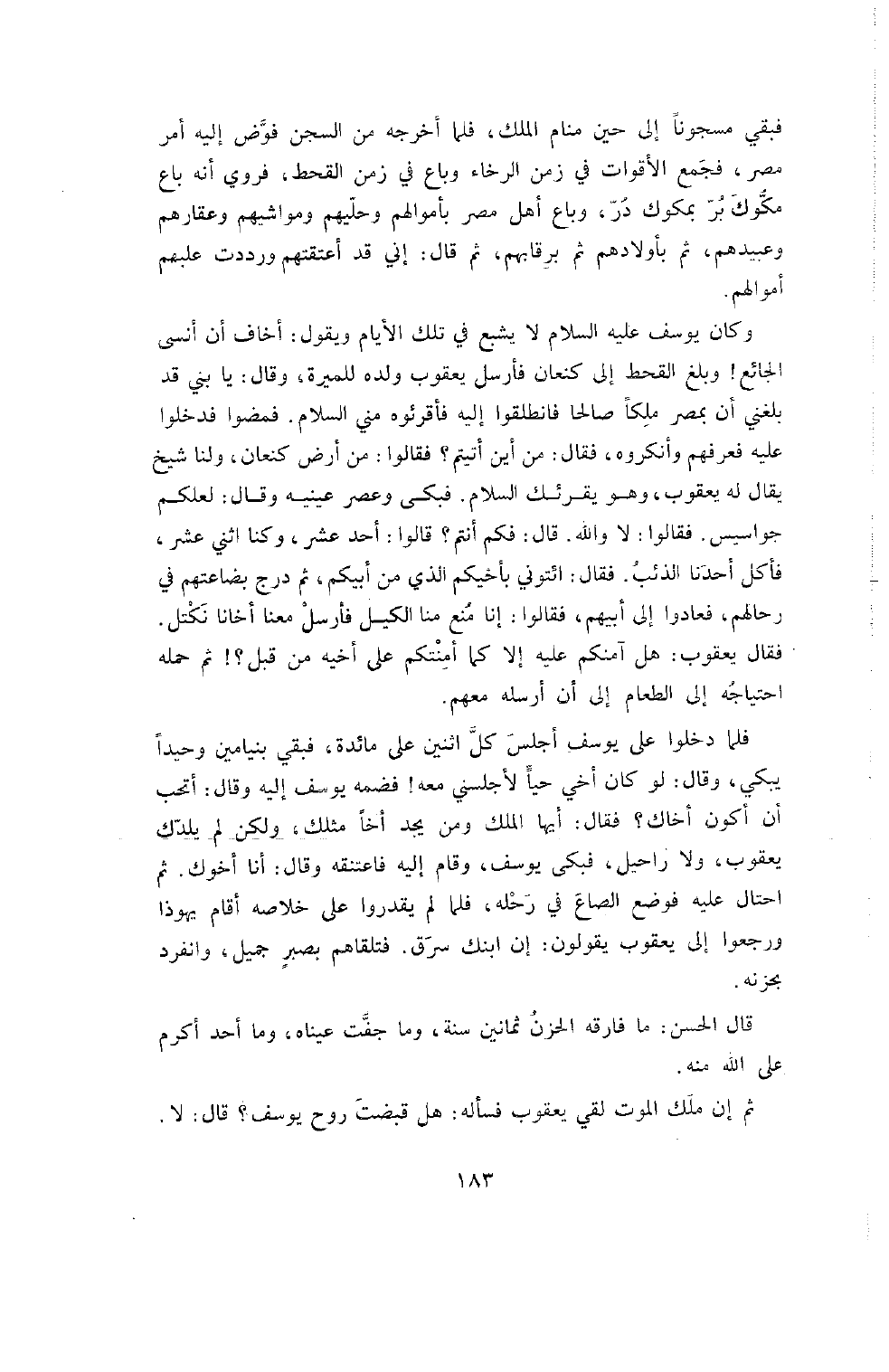 فَلَمَّا دَخَلُوا عَلَى يُوسُفَ أَجْلَسَ كُلَّ اثْنَيْنِ عَلَى مَائِدَةٍ , فَبَقِيَ بِنْيَامِينُ وَحِيدًا يَبْكِي , وَقَالَ: لَوْ كَانَ أَخِي حَيًّا لأَجْلَسَنِي مَعَهُ! فَضَمَّهُ يُوسُفُ إِلَيْهِ وَقَالَ: أُتُحِبُّ أَنْ أَكُونَ أَخَاكَ؟ فَقَالَ: أَيُّهَا الْمَلِكُ وَمَنْ يَجِدُ أَخًا مِثْلَكَ , وَلَكِنْ لَمْ يَلِدْكَ يَعْقُوبُ وَلا رَاحِيلُ. فَبَكَى يُوسُفُ وَقَامَ إِلَيْهِ فَاعْتَنَقَهُ وَقَالَ أَنَا أَخُوكَ. ثُمَّ احْتَالَ عَلَيْهِ فَوَضَعَ الصَّاعَ فِي رَحْلِهِ , فَلَمَّا لَمْ يَقْدِرُوا عَلَى خَلاصِهِ أَقَامَ يَهُوذَا وَرَجَعُوا إِلَى يعقوب يقولون إن ابنك سرق. فَتَلَقَّاهُمْ بِصَبْرٍ جَمِيلٍ وَانْفَرَدَ بِحُزْنِهِ.