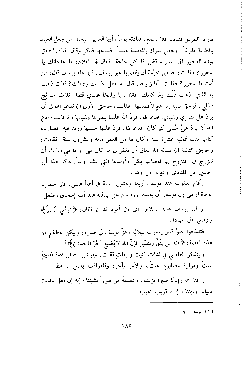 قَارِعَةِ الطَّرِيقِ فَتُنَادِيهِ فَلا يَسْمَعُ , فَنَادَتْهُ يَوْمًا: أَيُّهَا الْعَزِيزُ سُبْحَانَ مَنْ جَعَلَ الْعَبِيدَ بِالطَّاعَةِ مُلُوكًا وَجَعَلَ الْمُلُوكَ بِالْمَعْصِيَةِ عَبِيدًا! فَسَمِعَهَا فَبَكَى وَقَالَ لِفَتَاهُ: انْطَلِقْ بِهَذِهِ الْعَجُوزِ إِلَى الدَّارِ وَاقْضِ لَهَا كُلَّ حَاجَةٍ. فَقَالَ لَهَا الْغُلامُ: مَا حَاجَاتُكَ يَا عَجُوزُ؟ فَقَالَتْ: حَاجَتِي مُحَرَّمَةٌ أَنْ يَقْضِيَهَا غَيْرُ يُوسُفَ. فَلَمَّا جَاءَ يُوسُفُ قَالَ: مَنْ أَنْتِ يَا عَجُوزُ؟ فَقَالَتْ: أَنَا زُلَيْخَا. قَالَ: مَا فَعَلَ حُسْنُكِ وَجَمَالُكِ؟ قَالَتْ ذَهَبَ بِهِ الَّذِي أَذْهَبَ ذُلَّكَ وَمَسْكَنَتَكَ. فَقَالَ: يَا زُلَيْخَا عِنْدِي قَضَاءُ ثَلاثِ حَوَائِجَ فَسَلِي , فَوَحَقِّ شَيْبَةِ إِبْرَاهِيمَ لأَقْضِيَنَّهَا. فَقَالَتْ: حَاجَتِي الأُولَى
