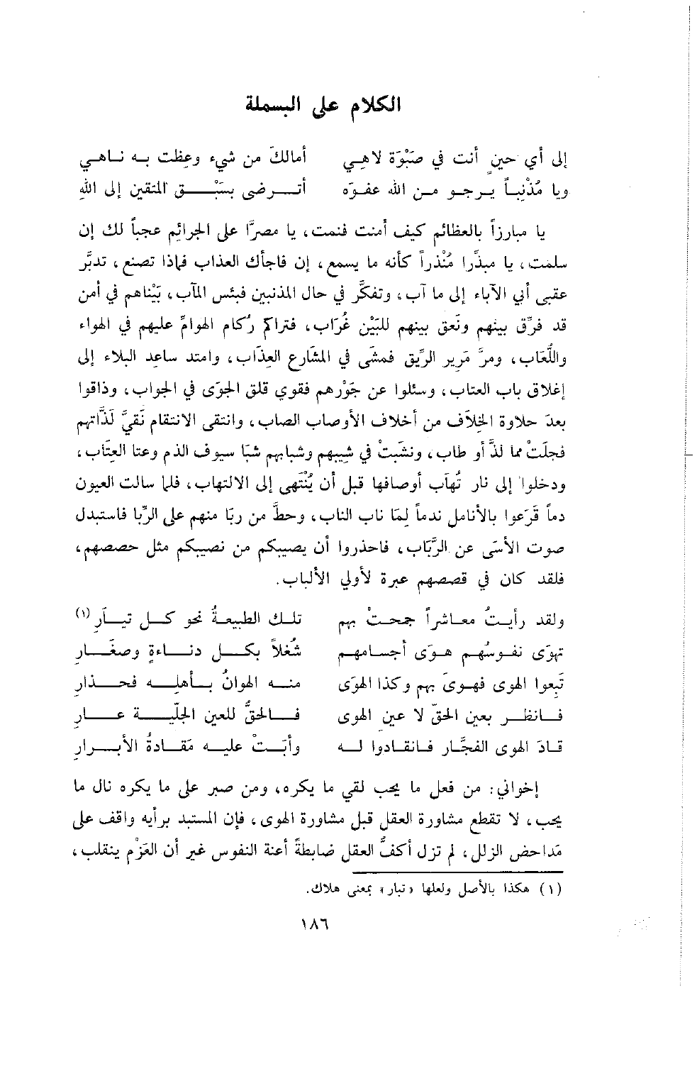 (تَبِعُوا الْهَوَى فَهَوَى بِهِمْ وَكَذَا الْهَوَى ... مِنْهُ الْهَوَانُ بِأَهْلِهِ فَحَذَارِ)