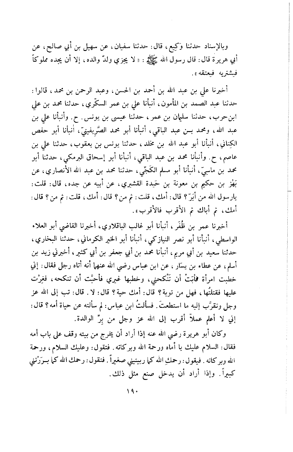 حَدَّثَنَا سُلَيْمَانُ بْنُ عُمَرَ , حَدَّثَنَا عِيسَى بْنُ يُونُسَ. ح. وأنبأنا علي بن عبد الله، ومحمد ابن عَبْدِ الْبَاقِي , أَنْبَأَنَا أَبُو مُحَمَّدٍ الصَّرِيفِينِيُّ , أَنْبَأَنَا أَبُو حَفْصٍ الْكِنَانِيُّ , أَنْبَأَنَا أَبُو عَبْدِ اللَّهِ ابن مَخْلَدٍ , حَدَّثَنَا يُونُسُ بْنُ يَعْقُوبَ , حَدَّثَنَا عَلِيُّ بن عاصم. ح. وَأَنْبَأَنَا مُحَمَّدُ بْنُ عَبْدِ الْبَاقِي , أَنْبَأَنَا أَبُو إِسْحَاقَ الْبَرْمَكِيُّ , حَدَّثَنَا أَبُو مُحَمَّدِ بْنُ مَاسِيٍّ , أَنْبَأَنَا أَبُو مُسْلِمٍ الْكَجِّيُّ , حَدَّثَنَا مُحَمَّدُ بْنُ عَبْدِ اللَّهِ الأَنْصَارِيُّ , عَنْ بَهْزِ بْنِ حَكِيمِ بن معونة بْنِ حِيدَةَ الْقُشَيْرِيِّ , عَنْ أَبِيهِ عَنْ جَدِّهِ , قَالَ قُلْتُ: يَا رَسُولَ اللَّهِ مَنْ أَبَرُّ؟ قَالَ: أُمَّكَ. قُلْتُ: ثُمَّ مَنْ؟ قَالَ: أُمَّكَ. قُلْتُ: ثُمَّ مَنْ؟ قَالَ: أُمَّكَ. ثُمَّ أَبَاكَ ثُمَّ الأَقْرَبَ فَالأَقْرَبَ ".