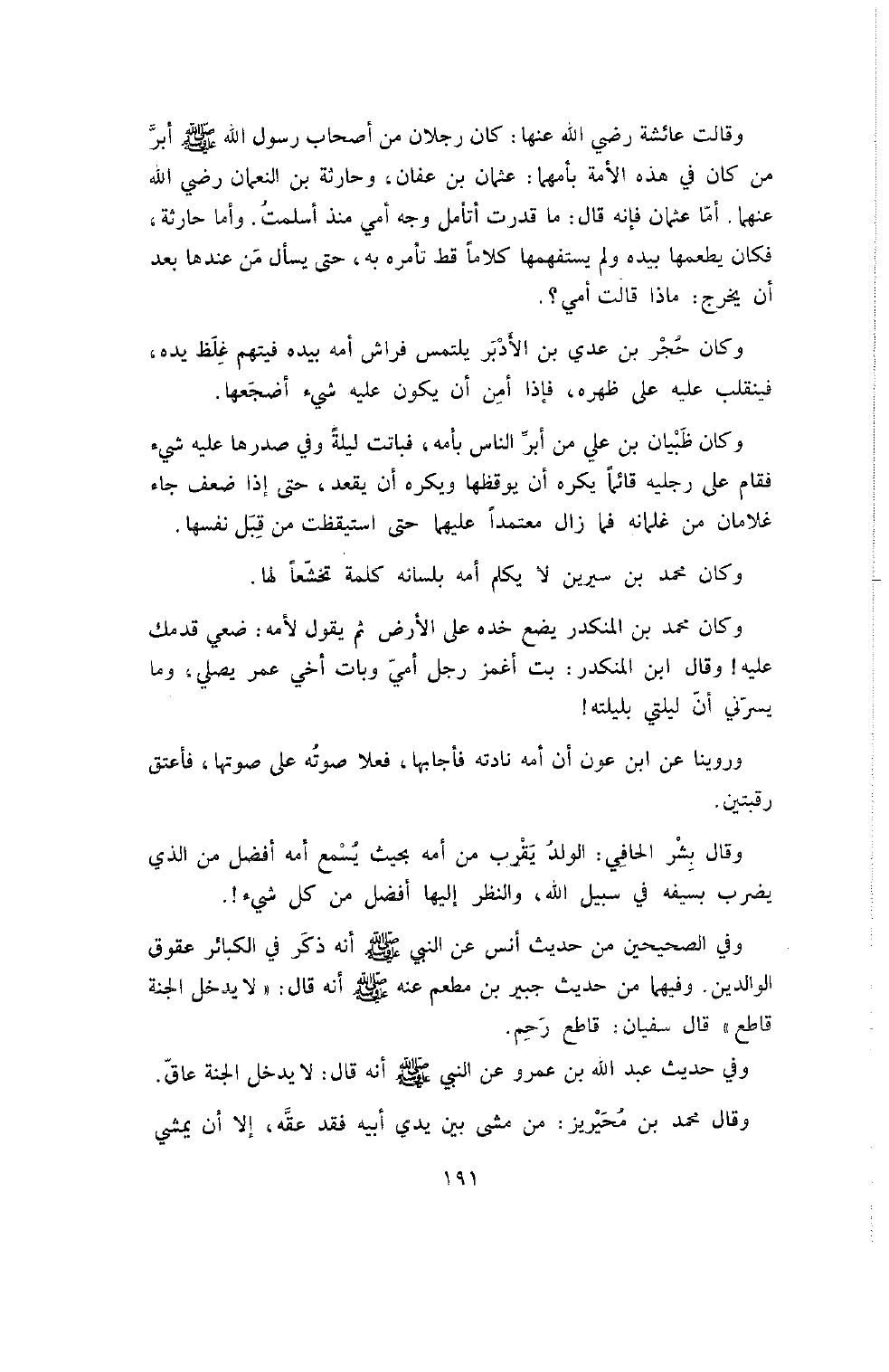 وَقَالَ بِشْرٌ الْحَافِي: الْوَلَدُ يَقْرُبُ مِنْ أُمِّهِ بِحَيْثُ يَسْمَعُ أُمَّهُ أَفْضَلُ مِنَ الَّذِي يَضْرِبُ بِسَيْفِهِ فِي سَبِيلِ اللَّهِ , وَالنَّظَرُ إِلَيْهَا أَفْضَلُ مِنْ كُلِّ شَيْءٍ!