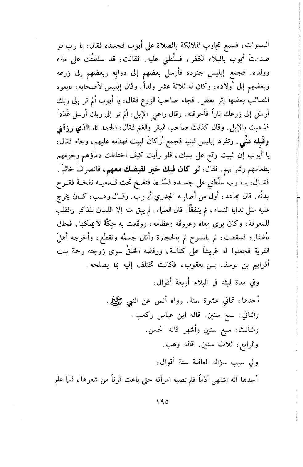 تَابِعُوهُ الْمَصَائِبَ بَعْضَهَا إِثْرَ بَعْضٍ. فَجَاءَ صَاحِبُ الزَّرْعِ فَقَالَ: يَا أَيُّوبُ أَلَمْ تَرَ إِلَى رَبِّكَ أَرْسَلَ إِلَى زَرْعِكَ نَارًا فَأَحْرَقَتْهُ. وَقَالَ: رَاعِي الإِبِلِ أَلَمْ تَرَ إِلَى رَبِّكَ أَرْسَلَ غُدَدًا فَذَهَبَتْ الإبل. وَقَالَ كَذَلِكَ صَاحِبُ الْبَقَرِ وَالْغَنَمِ. فَقَالَ: الْحَمْدُ للَّهِ الَّذِي رَزَقَنِي وَقَبِلَهُ مِنِّي. وَتَفَرَّدَ إِبْلِيسُ لِبَنِيهِ فَجَمَعَ أَرْكَانَ الْبَيْتِ فَهَدَمَهُ عَلَيْهِمْ وَجَاءَ فَقَالَ: يَا أَيُّوبُ إِنَّ الْبَيْتَ وَقَعَ عَلَى بَنِيكَ , فَلَوْ رَأَيْتَ كَيْفَ اخْتَلَطَتْ دِمَاؤُهُمْ وَلُحُومُهُمْ بِطَعَامِهِمْ وَشَرَابِهِمْ. فَقَالَ: لَوْ كَانَ فِيكَ خَيْرٌ لَقَبَضَكَ مَعَهُمْ فَانْصَرَفَ خَائِبًا. فَقَالَ: يَا رَبِّ سَلِّطْنِي عَلَى جَسَدِهِ فَسُلِّطَ فَنَفَخَ تَحْتَ قَدَمَيْهِ نَفْخَةً فَقَرَّحَ بَدَنَهُ. قَالَ مُجَاهِدٌ: أَوَّلُ مَنْ أَصَابَهُ الْجُدَرِيُّ أَيُّوبُ. وَقَالَ وَهْبٌ: كَانَ يَخْرُجُ عَلَيْهِ مِثْلُ ثَدَايَا النِّسَاءِ ثُمَّ يَتَفَقَّأُ. قَالَ الْعُلَمَاءُ: لَمْ يَبْقَ مِنْهُ إِلا اللِّسَانُ لِلذِّكْرِ وَالْقَلْبُ لِلْمَعْرِفَةِ، وَكَانَ يَرَى مِعَاهُ وَعُرُوقَهُ وَعِظَامَهُ , وَوَقَعَتْ بِهِ حِكَّةٌ لا يَمْلِكُهَا , فَحَكَّ بِأَظْفَارِهِ فَسَقَطَتْ , ثُمَّ بِالْمُسُوحِ ثُمَّ بِالْحِجَارَةِ وَأَنْتَنَ جِسْمُهُ وَتَقَطَّعَ , وَأَخْرَجَهُ أَهْلُ الْقَرْيَةِ فَجَعَلُوا لَهُ عَرِيشًا عَلَى كُنَاسَةٍ، وَرَفَضَهُ الْخَلْقُ سِوَى زَوْجَتِهِ رَحْمَةَ بنت أفرايم بن يوسف ابن يَعْقُوبَ , فَكَانَتْ تَخْتَلِفُ إِلَيْهِ بِمَا يُصْلِحُهُ.