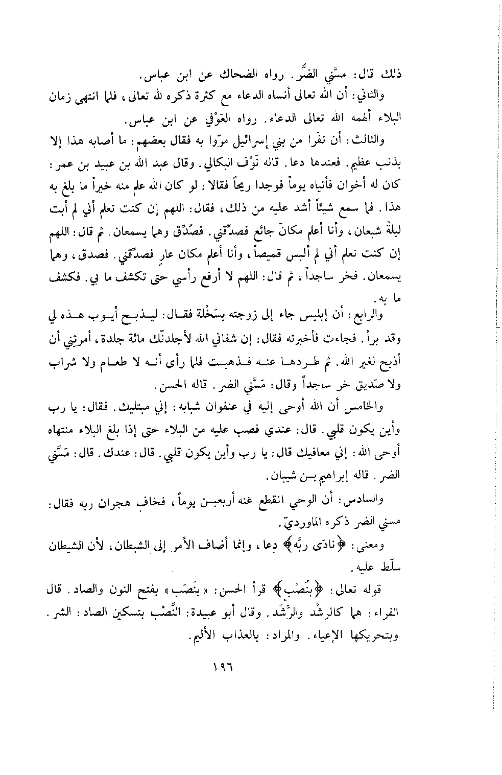 لَمْ أَبِتْ لَيْلَةً شَبْعَانَ وَأَنَا أَعْلَمُ مَكَانَ جَائِعٍ فَصَدِّقْنِي. فَصُدِّقَ وَهُمَا يَسْمَعَانِ. ثُمَّ قَالَ: اللَّهُّمَ إِنْ كُنْتَ تَعْلَمُ أَنِّي لَمْ أَلْبَسْ قَمِيصًا وَأَنَا أَعْلَمُ مَكَانَ عَارٍ فَصَدِّقْنِي. فَصُدِّقَ وَهُمَا يَسْمَعَانِ , فَخَرَّ سَاجِدًا ثُمَّ قَالَ: اللَّهُمَّ لا أَرْفَعُ رَأْسِي حَتَّى تَكْشِفَ مَا بِي. فَكَشَفَ مَا بِهِ. وَالرَّابِعُ: أَنَّ إِبْلِيسَ جَاءَ إِلَى زَوْجَتِهِ بِسَخْلَةٍ فَقَالَ: لِيَذْبَحْ أَيُّوبُ هَذِهِ لِي وَقَدْ بَرَأَ. فَجَاءَتْ فَأَخْبَرَتْهُ فَقَالَ: إِنْ شَفَانِيَ اللَّهُ لأَجْلِدَنَّكِ مِائَةَ جَلْدَةٍ , أَمَرْتِنِي أَنْ أَذْبَحَ لِغَيْرِ اللَّهِ. ثُمَّ طَرَدَهَا عَنْهُ فَذَهَبَتْ فَلَمَّا رَأَى أَنَّهُ لا طَعَامٌ وَلا شَرَابٌ وَلا صَدِيقٌ خَرَّ سَاجِدًا وَقَالَ: مَسَّنِيَ الضُّرُّ. قَالَهُ الْحَسَنُ. وَالْخَامِسُ: أَنَّ اللَّهَ أَوْحَى إِلَيْهِ فِي عُنْفُوَانِ شَبَابِهِ: إِنِّي مُبْتَلِيكَ. فَقَالَ: يَا رَبِّ وَأَيْنَ يَكُونُ قَلْبِي. قَالَ: عِنْدِي فَصَبَّ عَلَيْهِ مِنَ الْبَلاءِ حَتَّى إِذَا بَلَغَ الْبَلاءُ مُنْتَهَاهُ أَوْحَى اللَّهُ: إِنِّي مُعَافِيكَ قَالَ: يَا رَبِّ وَأَيْنَ يَكُونُ قَلْبِي. قَالَ: عِنْدَكَ. قَالَ مَسَّنِيَ الضُّرُّ. قاله إبراهيم ابن شيبان. والسادس: أَنَّ الْوَحْيَ انْقَطَعَ عَنْهُ أَرْبَعِينَ يَوْمًا , فَخَافَ هِجْرَانَ رَبِّهِ فَقَالَ: مَسَّنِيَ الضُّرُّ ذَكَرَهُ الْمَاوَرْدِيُّ.