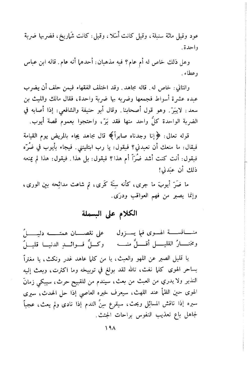 يَا قَلِيلَ الصَّبْرِ عَنِ اللَّهْوِ وَالْعَبَثِ، يَا مَنْ كُلَّمَا عَاهَدَ غَدَرَ وَنَكَثَ , يا مغترا بساحر الهوى كما نَفَثَ , تَاللَّهِ لَقَدْ بُولِغَ فِي تَوْبِيخِهِ وَمَا اكْتَرَثَ , وَبَعَثَ إِلَيْهِ النَّذِيرَ وَلا يَدْرِي مِنَ الْعَبَثِ مَنْ بَعَثَ , سَيَنْدَمُ مَنْ لِلْقَبِيحِ حَرَثَ , سَيَبْكِي زَمَانَ الْهَوَى حِينَ الظَّمَإِ عِنْدَ اللَّهَثِ , سَيَعْرِفُ خَبَرَهُ الْعَاصِي إِذَا حَلَّ الْحَدَثُ , سَيَرَى سِيَرَهُ إِذَا نَاقَشَ الْمَسَائِلَ وَبَحَثَ , سَيَقْرَعُ سِنَّ الندم إذا نادى ولم يعث , عَجَبًا لِجَاهِلٍ بَاعَ تَعْذِيبَ النُّفُوسِ بِرَاحَاتِ الْجُثَثِ.