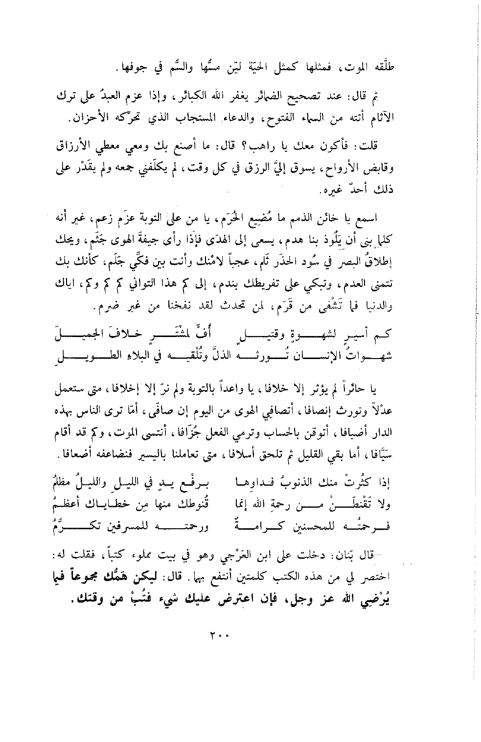 يَا حَائِرًا لَمْ يُؤْثِرْ إِلا خِلافًا , يَا وَاعِدًا بِالتَّوْبَةِ وَلَمْ نَرَ إِلا إِخْلافًا , مَتَى سَتَعْمَلُ عَدْلا وَتُورِثُ إِنْصَافًا , أَتُصَافِي الْهَوَى مِنَ اليوم إذا صَافَى , أَمَا تَرَى النَّاسَ بِهَذِهِ الدَّارِ أَضْيَافًا , أتوقن بالحساب وترمي الفعل جُزَافًا , أَتَنْسَى الْمَوْتَ وَكَمْ قَدْ أَقَامَ سَيَّافًا , أَمَا بَقِيَ الْقَلِيلُ ثُمَّ تَلْحَقُ أَسْلافًا , مَتَى تعاملنا باليسير فنضاعفه أَضْعَافًا.
