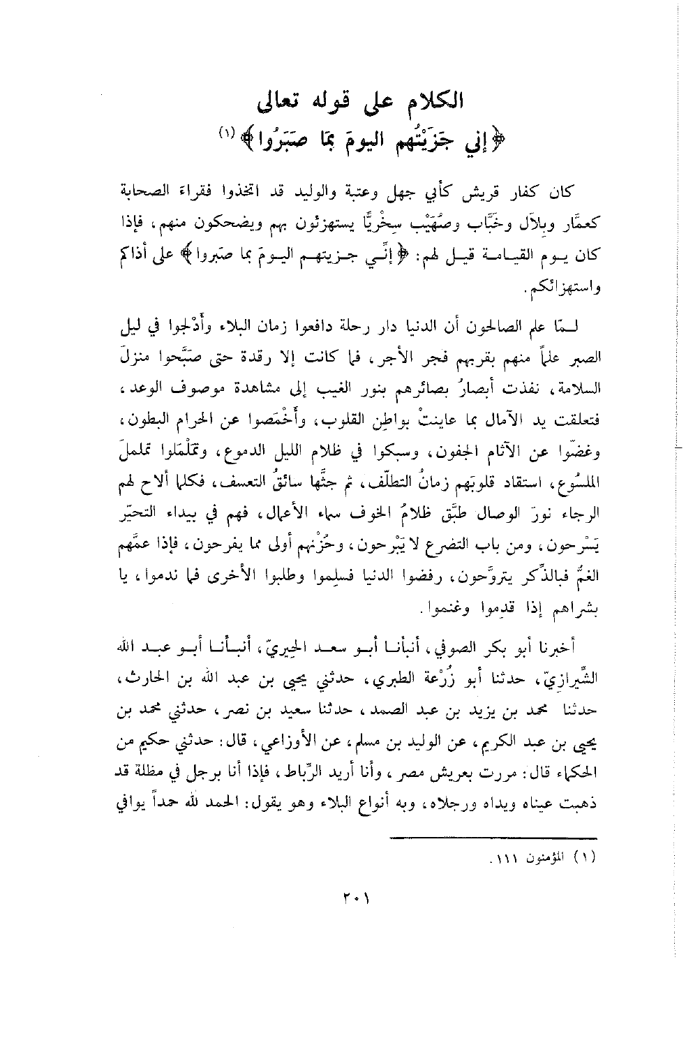 {إِنِّي جَزَيْتُهُمُ الْيَوْمَ بما صبروا} كَانَ كُفَّارُ قُرَيْشٍ كَأَبِي جَهْلٍ وَعُتْبَةَ وَالْوَلِيدِ قَدِ اتَّخَذُوا فُقَرَاءَ الصَّحَابَةِ كَعَمَّارٍ وَبِلالٍ وَخَبَّابٍ وصهيب سخرياً يستهزءون بِهِمْ وَيَضْحَكُونَ مِنْهُمْ , فَإِذَا كَانَ يَوْمُ الْقِيَامَةِ قِيلَ لَهُمْ: {إِنِّي جَزَيْتُهُمُ الْيَوْمَ بِمَا صَبَرُوا} على أذاكم واستهزائكم.