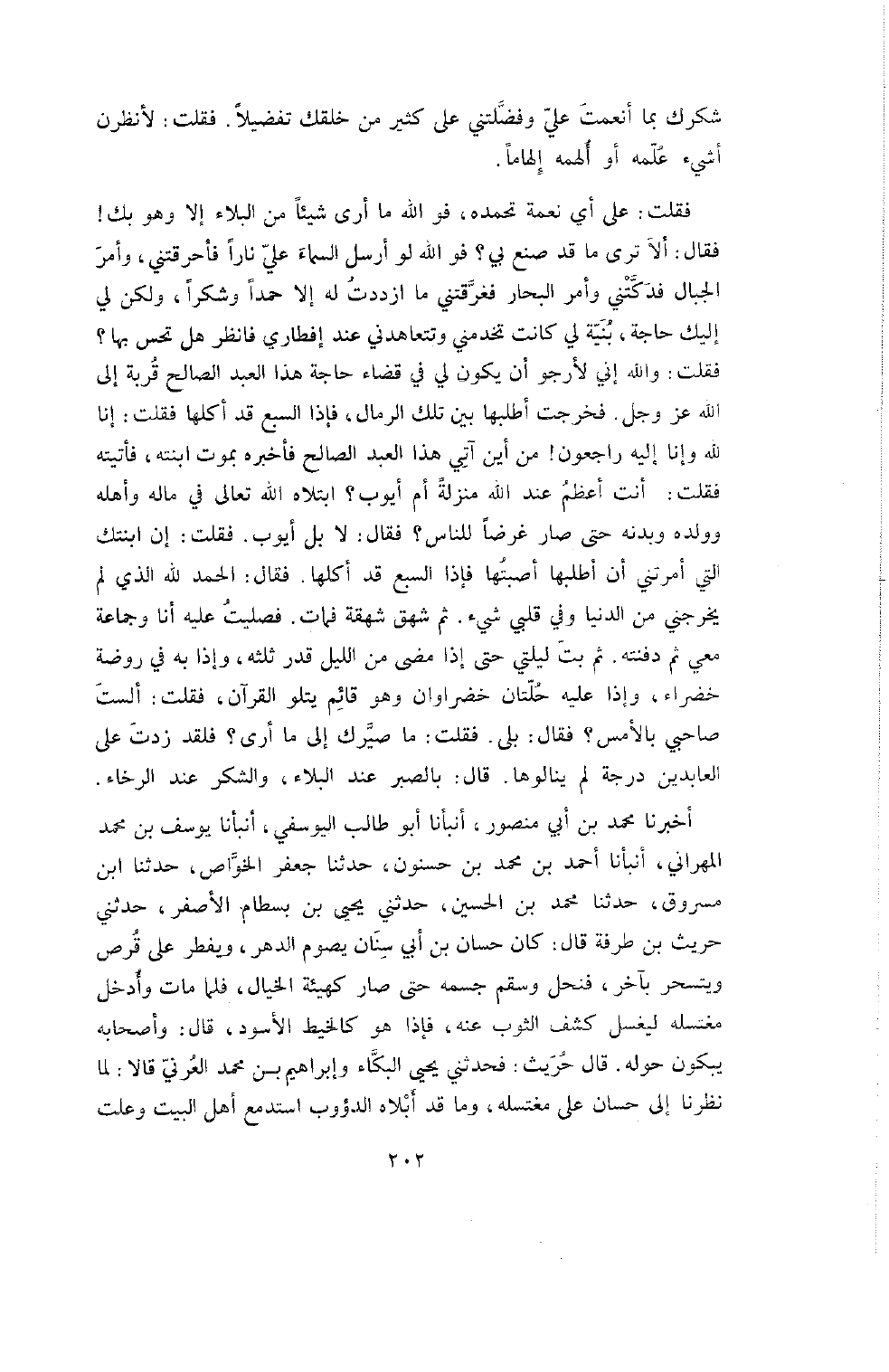 شُكْرَكَ بِمَا أَنْعَمْتَ عَلَيَّ وَفَضَّلْتَنِي عَلَى كَثِيرٍ مِنْ خَلْقِكَ تَفْضِيلا. فَقُلْتُ: لأَنْظُرَنَّ أَشَيْءٌ عُلِّمَهُ أَوْ أُلْهِمَهُ إِلْهَامًا. فَقُلْتُ: عَلَى أَيِّ نِعْمَةٍ تَحْمَدُهُ , فَوَاللَّهِ مَا أَرَى شَيْئًا مِنَ الْبَلاءِ إِلا وَهُوَ بِكَ! فَقَالَ: أَلا تَرَى مَا قد صَنَعَ بِي؟ فَوَاللَّهِ لَوْ أَرْسَلَ السَّمَاءَ عَلَيَّ نَارًا فَأَحْرَقَتْنِي وَأَمَرَ الْجِبَالَ فَدَكَّتْنِي وَأَمَرَ الْبِحَارَ فَغَرَّقَتْنِي مَا ازْدَدْتُ لَهُ إِلا حَمْدًا وَشُكْرًا , وَلَكِنْ لِي إِلَيْكَ حَاجَةٌ , بُنَيَّةٌ لِي كَانَتْ تَخْدِمُنِي وَتَتَعَاهَدُنِي عِنْدَ إِفْطَارِي فَانْظُرْ هَلْ تُحِسُّ بِهَا؟ فَقُلْتُ: وَاللَّهِ إِنِّي لأَرْجِو أَنْ يَكُونَ لِي فِي قَضَاءِ حَاجَةِ هَذَا الْعَبْدِ الصَّالِحِ قُرْبَةٌ إِلَى اللَّهِ عَزَّ وَجَلَّ. فَخَرَجْتُ أَطْلُبُهَا بَيْنَ تِلْكَ الرِّمَالِ فَإِذَا السَّبُعُ قَدْ أَكَلَهَا فقلت: إنا لله وإنا إِلَيْهِ رَاجِعُونَ! مِنْ أَيْنَ آتِي هَذَا الْعَبْدَ الصَّالِحَ فَأُخْبِرُهُ بِمَوْتِ ابْنَتِهِ , فَأَتَيْتُهُ