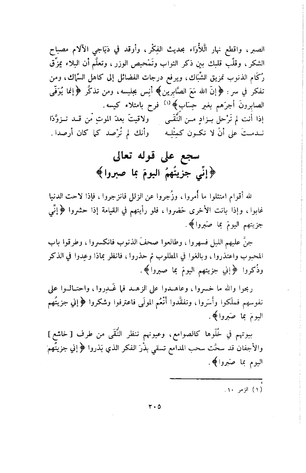 بُيُوتُهُمْ فِي خُلُوِّهَا كَالصَّوَامِعِ , وَعُيُونُهُمْ تَنْظُرُ بِالتُّقَى من طرف [خَاشِعٍ] وَالأَجْفَانُ قَدْ سَحَّتْ سُحُبَ الْمَدَامِعِ تَسْقِي بَذْرَ الْفِكْرِ الَّذِي بَذَرُوا {إِنِّي جَزَيْتُهُمُ الْيَوْمَ بما صبروا} .