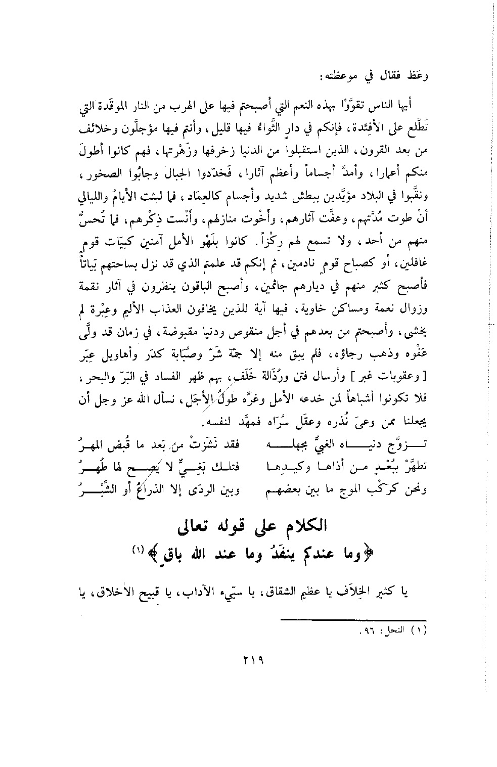 أَيُّهَا النَّاسُ تَقَوُّوا بِهَذِهِ النِّعَمِ الَّتِي أَصْبَحْتُمْ فِيهَا عَلَى الْهَرَبِ مِنَ النَّارِ الْمُوقَدَةِ الَّتِي تَطَّلِعُ عَلَى الأَفْئِدَةِ , فَإِنَّكُمْ فِي دَارِ الثَّوَاءِ فِيهَا قَلِيلٌ , وَأَنْتُمْ فِيهَا مُؤَجَّلُونَ وَخَلائِفُ مِنْ بَعْدِ الْقُرُونِ , الَّذِينَ اسْتَقْبَلُوا مِنَ الدُّنْيَا زُخْرُفَهَا وَزَهْرَتَهَا , فَهُمْ كَانُوا أَطْوَلَ مِنْكُمْ أَعْمَارًا وَأَمَدَّ أَجْسَامًا وَأَعْظَمَ آثَارًا , فحددوا الْجِبَالَ وَجَابُوا الصُّخُورَ , وَنَقَّبُوا فِي الْبِلادِ مُؤَيَّدِينَ بِبَطْشٍ شَدِيدٍ وَأَجْسَامٍ كَالْعِمَادِ , فَمَا لَبِثَتِ الأَيَّامُ وَاللَّيَالِي أَنْ طَوَتْ مُدَّتَهُمْ , وَعَفَتْ آثَارَهُمْ , وَأَخْوَتْ مَنَازِلَهُمْ , وَأَنْسَتْ ذِكْرَهُمْ , فَمَا تُحِسُّ مِنْهُمْ مِنْ أَحَدٍ وَلا تَسْمَعُ لَهُمْ رِكْزًا. كَانُوا بِلَهْوِ الأَمَلِ آمِنِينَ كَبَيَاتِ قَوْمٍ غَافِلِينَ أَوْ كَصَبَاحِ قَوْمٍ نَادِمِينَ , ثُمَّ إِنَّكُمْ قَدْ عَلِمْتُمُ الَّذِي قَدْ نَزَلَ بِسَاحَتِهِمْ بَيَاتًا فَأَصْبَحَ كَثِيرٌ مِنْهُمْ فِي دِيَارِهِمْ جَاثِمِينَ , وَأَصْبَحَ الْبَاقُونَ يَنْظُرُونَ فِي آثَارِ نِقْمَةٍ وَزَوَالِ نِعْمَةٍ وَمَسَاكِنَ خَاوِيَةٍ , فِيهَا آيَةٌ لِلَّذِينَ يَخَافُونَ الْعَذَابَ الأَلِيمَ وَعِبْرَةٌ لِمَنْ يَخْشَى , وَأَصْبَحْتُمْ مِنْ بَعْدِهِمْ فِي أَجَلٍ مَنْقُوصٍ وَدُنْيَا مَقْبُوضَةٍ , فِي زَمَانٍ قَدْ وَلَّى عَفْوُهُ وَذَهَبَ رَجَاؤُهُ , فَلَمْ يَبْقَ مِنْهُ إِلا جُمَّةُ شَرٍّ وَصَبَابَةُ كَدَرٍ وَأَهَاوِيلُ عِبَرٍ [وَعُقُوبَاتُ غُبَرٍ] وَأَرْسَالُ فِتَنٍ وَرَذَالَةُ خَلَفٍ , بِهِمْ ظَهَرَ الْفَسَادُ فِي الْبَرِّ وَالْبَحْرِ , فَلا تَكُونُوا أَشْبَاهًا لِمَنْ خَدَعَهُ الأَمَلُ وَغَرَّهُ طُولُ الأَجَلِ , نَسْأَلُ اللَّهَ عَزَّ وَجَلَّ أَنْ يَجْعَلَنَا مِمَّنْ وَعَى نَذَرَهُ وعقل سراه فمهد لِنَفْسِهِ.