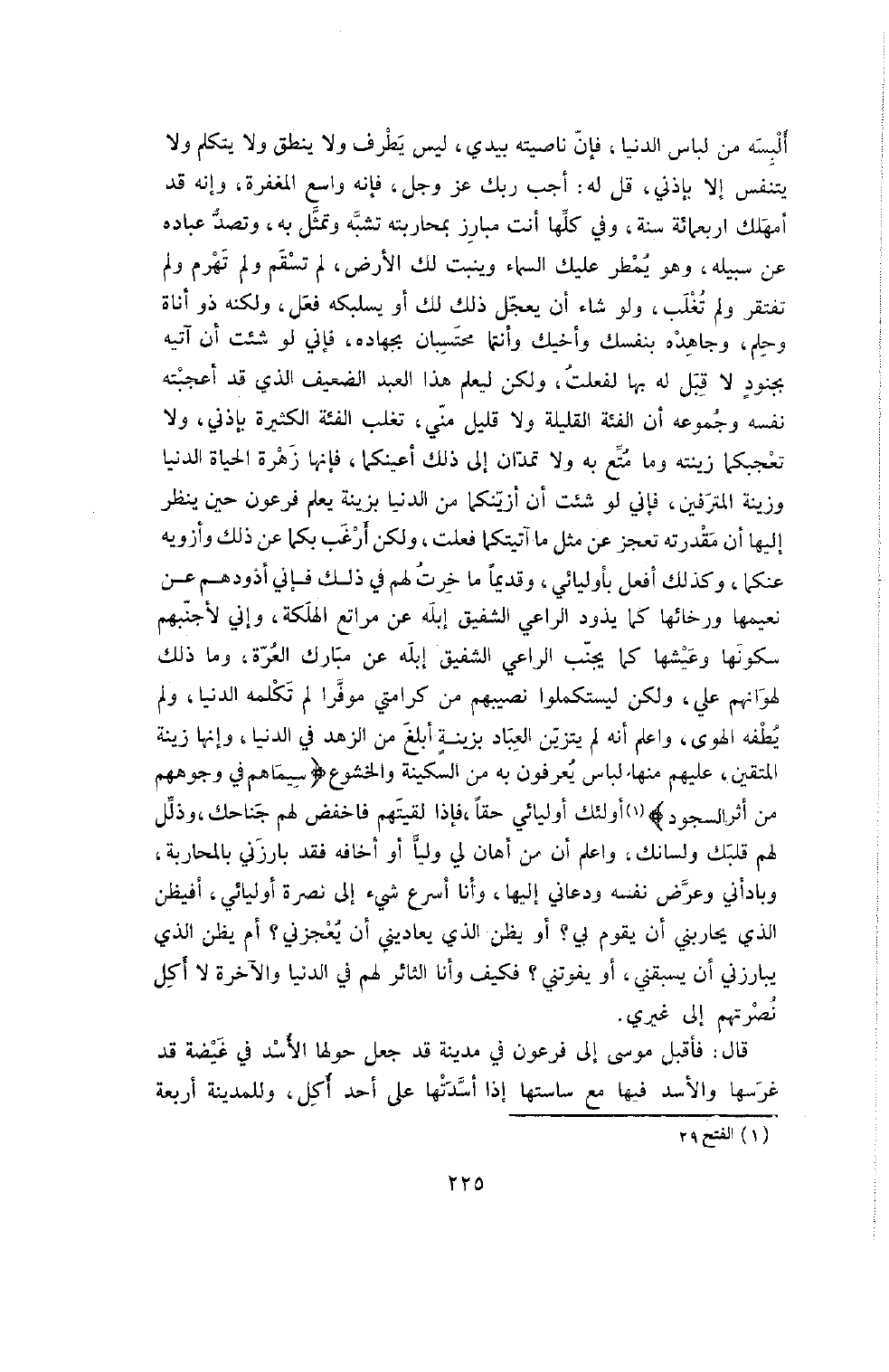 وَهُوَ يُمْطِرُ عَلَيْكَ السَّمَاءَ وَيُنْبِتُ لَكَ الأَرْضَ , لَمْ تَسْقَمْ وَلَمْ تَهْرَمْ وَلَمْ تَفْتَقِرْ وَلَمْ تُغْلَبْ , وَلْو شَاءَ أَنْ يُعَجِّلَ ذَلِكَ لَكَ أَوْ يَسْلُبَكَهُ فَعَلَ , وَلَكِنَّهُ ذُو أَنَاةٍ وَحِلْمٍ. وَجَاهِدْهُ بِنَفْسِكَ وَأَخِيكَ وَأَنْتُمَا مُحْتَسِبَانِ بِجِهَادِهِ , فَإِنِّي لَوْ شِئْتُ أَنْ آتِيَهُ بِجُنُودٍ لا قِبَلَ لَهُ بِهَا لَفَعَلْتُ , وَلَكِنْ لِيَعْلَمْ هَذَا الْعَبْدُ الضَّعِيفُ الَّذِي قَدْ أَعْجَبَتْهُ نَفْسُهُ وَجُمُوعُهُ أَنَّ الْفِئَةَ الْقَلِيلَةَ وَلا قَلِيلَ مِنِّي , تَغْلِبُ الْفِئَةَ الْكَثِيرَةَ بِإِذْنِي , وَلا تُعْجِبْكُمَا زِينَتَهُ وَمَا مُتِّعَ بِهِ وَلا تَمُدَّانِ إِلَى ذَلِكَ أَعْيُنَكُمَا , فَإِنَّهَا زَهْرَةُ الْحَيَاةِ الدُّنْيَا وَزِينَةُ الْمُتْرَفِينَ , فَإِنِّي لَوْ شِئْتُ أَنْ أُزَيِّنَكُمَا مِنَ الدُّنْيَا بِزِينَةٍ يَعْلَمُ فِرْعَوْنُ حِينَ يَنْظُرُ إِلَيْهَا أَنَّ مَقْدِرَتَهُ تَعْجِزُ عَنْ مثل ما آتيتكما فَعَلْتُ , وَلَكِنْ أَرْغَبُ بِكُمَا عَنْ ذَلِكَ وَأَزْوِيهِ عَنْكُمَا وَكَذَلِكَ أَفْعَلُ بِأَوْلِيَائِي , وَقَدِيمًا مَا خِرْتُ لهم في ذلك فإني أذودهم عن نعيمها ورخائها كما يذود الرَّاعِي الشَّفِيقُ إِبِلَهُ عَنْ مَرَاتِعِ الْهَلَكَةِ , وَإِنِّي لأُجَنِّبُهُمْ سُكُونَهَا وَعَيْشَهَا كَمَا يُجَنِّبُ الرَّاعِي الشَّفِيقُ إِبِلَهُ عَنْ مَبَارَكِ العُرّة , وَمَا ذَلِكَ لِهَوَانِهِمْ عَلَيَّ وَلَكِنْ لِيَسْتَكْمِلُوا نَصِيبَهُمْ مِنْ كَرَامَتِي مُوفَرًا لَمْ تَكْلِمْهُ الدُّنْيَا وَلَمْ يُطْفِهِ الْهَوَى , وَاعْلَمْ أَنَّهُ لَمْ يَتَزَيَّنِ الْعِبَادُ بِزِينَةٍ أَبْلَغَ مِنَ الزُّهْدِ فِي الدُّنْيَا , وَإِنَّهَا زِينَةُ الْمُتَّقِينَ , عَلَيْهِمْ مِنْهَا لِبَاسٌ يُعْرَفُونَ بِهِ مِنَ السَّكِينَةِ وَالْخُشُوعِ , سيماهم في وجوههم من أثر السجود , أُولَئِكَ أَوْلِيَائِي حَقًّا , فَإِذَا لَقِيتَهُمْ فَاخْفِضْ لَهُمْ جَنَاحَكَ وَذَلِّلْ لَهُمْ قَلْبَكَ وَلِسَانَكَ , وَاعْلَمْ أَنَّ مَنْ أَهَانَ لِي وَلِيًّا أَوْ أَخَافَهُ فَقَدْ بَارَزَنِي بِالْمُحَارَبَةِ وَبَادَأَنِي وَعَرَّضَ نَفْسَهُ وَدَعَانِي إِلَيْهَا , وَأَنَا أَسْرَعُ شَيْءٍ إِلَى نُصْرَةِ أَوْلِيَائِي , أَفَيَظُنُّ الَّذِي يُحَارِبُنِي أَنْ يَقُومَ بِي؟ أَوْ يَظُنُّ الَّذِي يُعَادِينِي أَنْ يُعْجِزَنِي؟ أَمْ يَظُنُّ الَّذِي يُبَارِزُنِي أَنْ يَسْبِقَنِي أَوْ يَفُوتَنِي؟ فَكَيْفَ وَأَنَا الثَّائِرُ لَهُمْ فِي الدُّنْيَا وَالآخِرَةِ لا أكِلُ نُصْرَتَهُمْ إِلَى غَيْرِي.