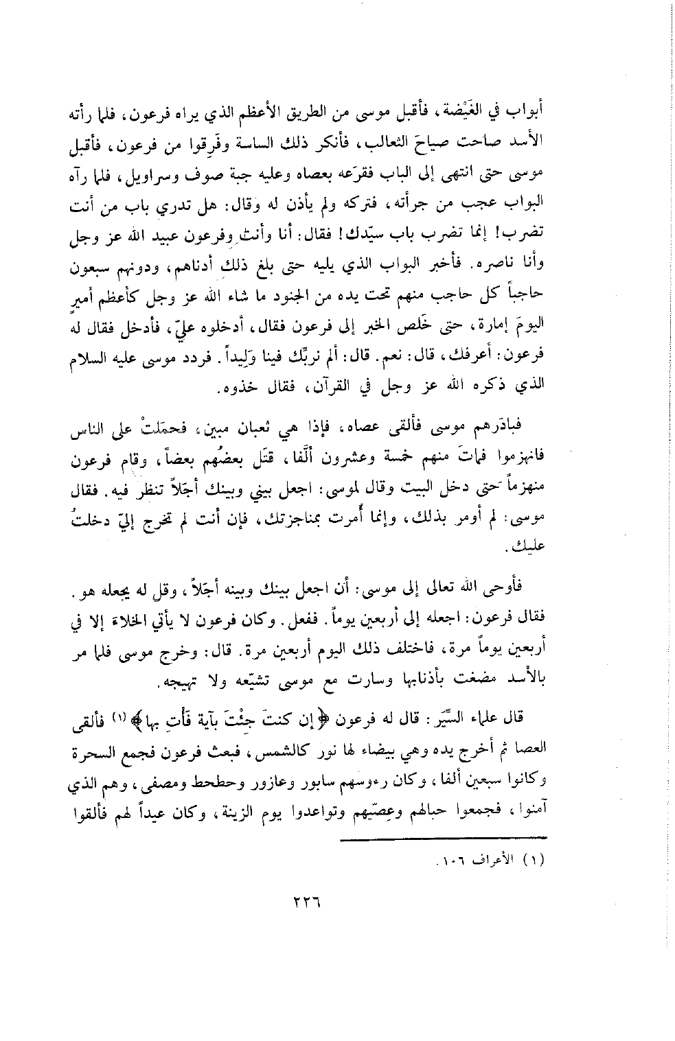 فِي الْغَيْضَةِ , فَأَقْبَلَ مُوسَى مِنَ الطَّرِيقِ الأَعْظَمِ الَّذِي يَرَاهُ فِرْعَوْنُ , فَلَمَّا رَأَتْهُ الأُسْدُ صَاحَتْ صِيَاحَ الثَّعَالِبِ , فَأَنْكَرَ ذَلِكَ السَّاسَةُ وَفَرَقُوا مِنْ فِرْعَوْنَ , فَأَقْبَلَ مُوسَى حَتَّى انْتَهَى إِلَى الْبَابِ فَقَرَعَهُ بِعَصَاهُ وَعَلَيْهِ جُبَّةُ صُوفٍ وَسَرَاوِيلُ , فَلَمَّا رَآهُ الْبَوَّابُ عَجِبَ مِنْ جُرْأَتِهِ , فَتَرَكَهُ وَلَمْ يَأْذَنْ لَهُ وَقَالَ: هَلْ تَدْرِي بَابَ مَنْ أَنْتَ تَضْرِبُ! إِنَّمَا تَضْرِبُ بَابَ سَيِّدِكَ! فَقَالَ: أَنَا وَأَنْتَ وَفِرْعَوْنُ عَبِيدُ اللَّهِ عَزَّ وَجَلَّ وَأَنَا نَاصِرُهُ. فَأَخْبَرَ الْبَوَّابُ الَّذِي يَلِيهِ حَتَّى بَلَغَ ذَلِكَ أَدْنَاهُمْ , وَدُونَهُمْ سَبْعُونَ حَاجِبًا كُلُّ حَاجِبٍ مِنْهُمْ تَحْتَ يَدِهِ مِنَ الْجُنُودِ مَا شَاءَ اللَّهُ عَزَّ وَجَلَّ كَأَعْظَمِ أَمِيرٍ الْيَوْمَ إِمَارَةً , حَتَّى خَلَصَ الْخَبَرُ إِلَى فِرْعَوْنَ فَقَالَ أَدْخِلُوهُ عَلَيَّ , فَأُدْخِلَ فَقَالَ لَهُ فِرْعَوْنُ: أَعْرِفُكَ. قَالَ: نَعَمْ. قَالَ: أَلَمْ نُرَبِّكَ فِينَا وليدا. فَرَدَّدَ مُوسَى عَلَيْهِ السَّلامُ الَّذِي ذَكَرَهُ اللَّهُ عَزَّ وَجَلَّ فِي الْقُرْآنِ , فَقَالَ: خُذُوهُ.