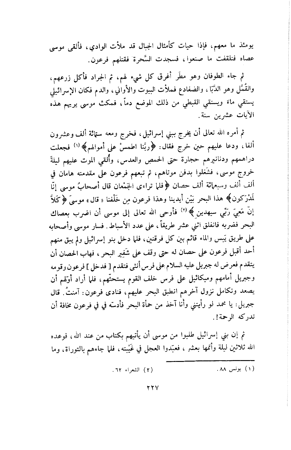 ثُمَّ جَاءَ الطُّوفَانُ وَهُوَ مَطَرٌ أَغْرَقَ كُلَّ شَيْءٍ لَهُمْ , ثُمَّ الْجَرَادُ فَأَكَلَ زَرْعَهُمْ , وَالْقُمَّلُ وَهُوَ الدَّبَا , وَالضَّفَادِعُ فَمَلأَتِ الْبُيُوتَ وَالأَوَانِيَ , وَالدَّمُ فَكَانَ الإِسْرَائِيلِيُّ يَسْتَقِي مَاءً وَيَسْتَقِي الْقِبْطِيُّ مِنْ ذَلِكَ الْمَوْضِعِ دَمًا , فَمَكَثَ مُوسَى يُرِيهِمْ هَذِهِ الآيَاتِ عِشْرِينَ سَنَةً.