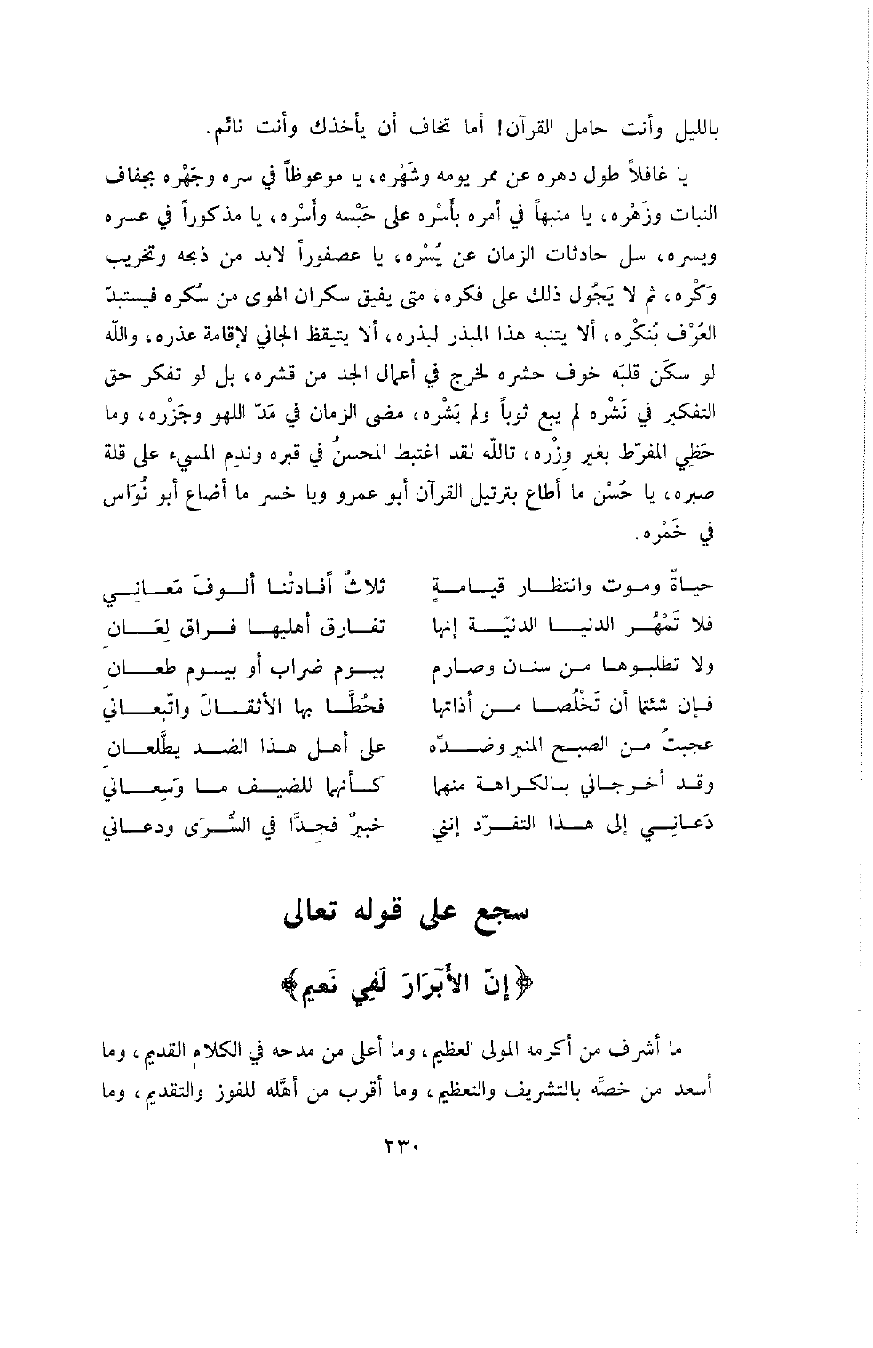 يَا غَافِلا طُولَ دَهْرِهِ عَنْ مَمَرِّ يَوْمِهِ وَشَهْرِهِ , يَا مَوْعُوظًا فِي سِرِّهِ وَجَهْرِهِ بِجَفَافِ النَّبَاتِ وَزَهْرِهِ , يَا مُنَبَّهًا فِي أَمْرِهِ بِأَسْرِهِ عَلَى حَبْسِهِ وَأَسْرِهِ , يَا مَذْكُورًا فِي عُسْرِهِ وَيُسْرِهِ , سَلْ حَادِثَاتِ الزَّمَانِ عَنْ يُسْرِهِ , يَا عُصْفُورًا لا بُدَّ مِنْ ذَبْحِهِ وَتَخْرِيبِ وَكْرِهِ , ثُمَّ لا يَجُولُ ذَلِكَ عَلَى فِكْرِهِ , مَتَى يَفِيقُ سَكْرَانُ الْهَوَى مِنْ سُكْرِهِ فَيَسْتَبِدُّ الْعِرْفُ بِنُكْرِهِ , أَلا يَتَنَبَّهُ هَذَا الْمُبَذِّرُ لِبَذْرِهِ , أَلا يَتَيَقَّظُ الْجَانِي لإِقَامَةِ عُذْرِهِ , وَاللَّهِ لَوْ سَكَّنَ قَلْبُهُ خَوْفَ حَشْرِهِ لَخَرَجَ فِي أَعْمَالِ الْجِدِّ مِنْ قِشْرِهِ , بَلْ لَوْ تَفَكَّرَ حَقَّ التَّفَكُّرِ فِي نَشْرِهِ لَمْ يَبِعْ ثَوْبًا وَلَمْ يَشْرِهِ , مَضَى الزَّمَانُ فِي مَدِّ اللَّهْوِ وَجَزْرِهِ , وَمَا حَظِيَ الْمُفَرِّطُ بِغَيْرِ وِزْرِهِ , تَاللَّهِ لَقَدِ اغْتَبَطَ الْمُحْسِنُ فِي قَبْرِهِ وَنَدِمَ الْمُسِيءُ عَلَى قِلَّةِ صَبْرِهِ , بأحسن مَا أَطَاعَ بِتَرْتِيلِ الْقُرْآنِ أَبُو عَمْرٍو وَيا خُسْرَ مَا أَضَاعَ أَبُو نُوَاسٍ فِي خَمْرِهِ.