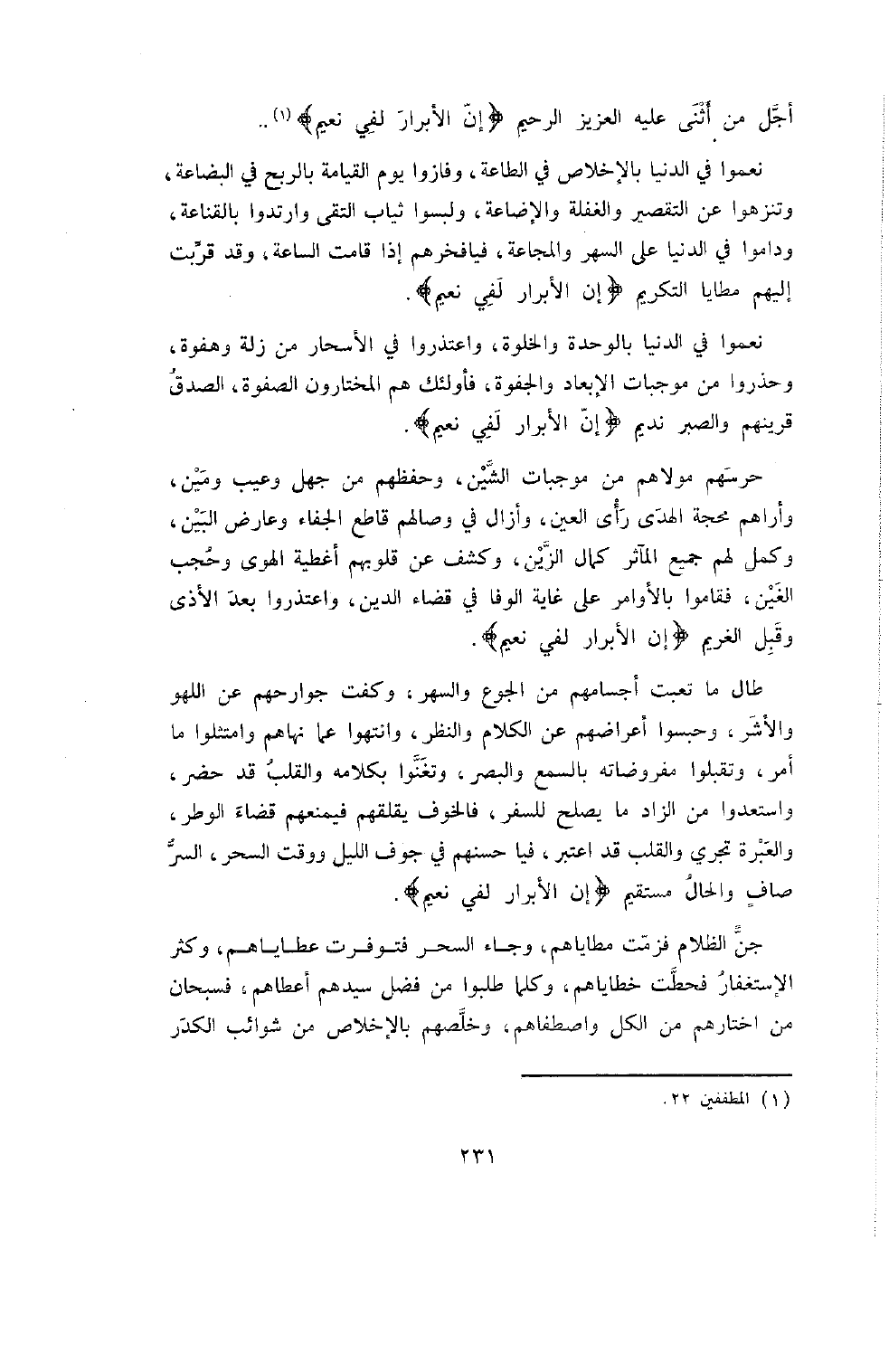 نُعِّمُوا فِي الدُّنْيَا بِالإِخْلاصِ فِي الطَّاعَةِ , وَفَازُوا يَوْمَ الْقِيَامَةِ بِالرِّبْحِ فِي الْبِضَاعَةِ , وَتَنَزَّهُوا عَنِ التَّقْصِيرِ وَالْغَفْلَةِ وَالإِضَاعَةِ , وَلَبِسُوا ثِيَابَ التُّقَى وَارْتَدَوْا بِالْقَنَاعَةِ , وَدَامُوا فِي الدُّنْيَا عَلَى السَّهَرِ وَالْمَجَاعَةِ , فَيَا فَخْرَهُمْ إِذَا قَامَتِ السَّاعَةُ , وَقَدْ قُرِّبَتْ إِلَيْهِمْ مَطَايَا التَّكْرِيمِ {إِنَّ الأَبْرَارَ لَفِي نَعِيمٍ} .