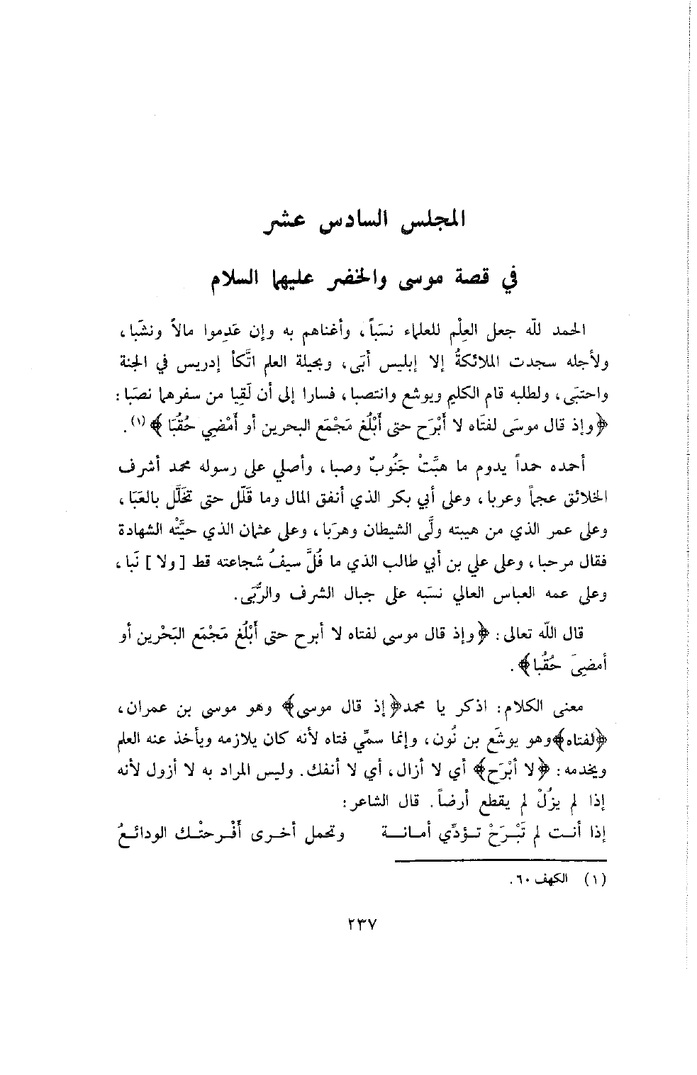الْحَمْدُ للَّهِ جَعَلَ الْعِلْمَ لِلْعُلَمَاءِ نَسَبًا , وَأَغْنَاهُمْ بِهِ وَإِنْ عَدِمُوا مالاًَ وَنَشَبًا , وَلأَجْلِهِ سَجَدَتِ الْمَلائِكَةُ إِلا إِبْلِيسَ أَبَى , وَبِحِيلَةِ الْعِلْمِ اتَّكَأَ إِدْرِيسُ فِي الْجَنَّةِ وَاحْتَبَى , وَلِطَلَبِهِ قَامَ الْكَلِيمُ وَيُوشَعُ وَانْتَصَبَا , فَسَارَا إِلَى أَنْ لَقِيَا مِنْ سَفَرِهِمَا نَصَبًا: {وَإِذْ قَالَ مُوسَى لِفَتَاهُ لا أَبْرَحُ حَتَّى أَبْلُغَ مَجْمَعَ الْبَحْرَيْنِ أَوْ أَمْضِيَ حُقُبًا} .