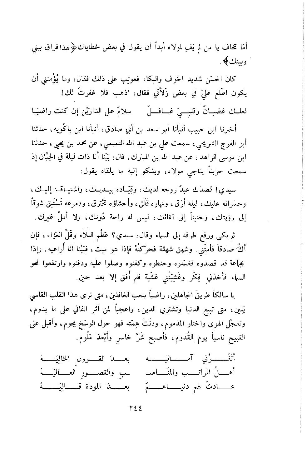 يَا سَالِكًا طَرِيقَ الْجَاهِلِينَ , رَاضِيًا بِلَعِبِ الْغَافِلِينَ , مَتَى نَرَى هَذَا الْقَلْبَ الْقَاسِيَ يَلِينُ , مَتَى تَبِيعُ الدُّنْيَا وَتَشْتَرِي الدِّينَ , واعجباً لِمَنْ آثَرَ الْفَانِيَ عَلَى مَا يَدُومُ , وَتَعَجَّلَ الْهَوَى وَاخْتَارَ الْمَذْمُومَ , وَدَنَتْ هِمَّتُهُ فَهُوَ حَوْلَ الْوَسَخِ يَحُومُ , وَأَقْبَلَ عَلَى الْقَبِيحِ نَاسِيًا يَوْمَ الْقُدُومِ , فَأَصْبَحَ شَرَّ خَاسِرٍ وَأَبْعَدَ مَلُومٍ.