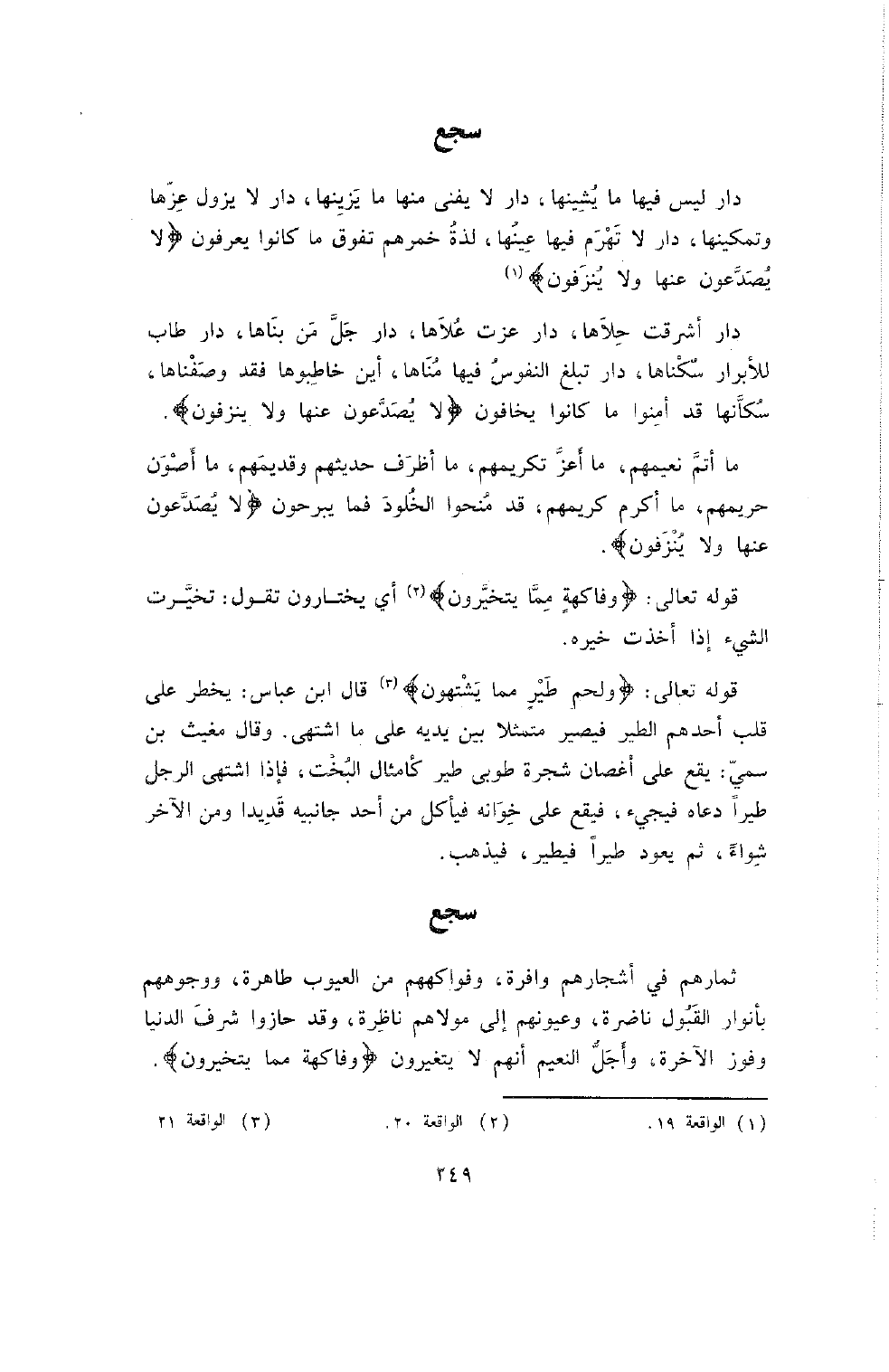 ثِمَارُهُمْ فِي أَشْجَارِهِمْ وَافِرَةٌ , وَفَوَاكِهُهُمْ مِنَ الْعُيُوبِ طَاهِرَةٌ , وَوُجُوهُهُمْ بِأَنْوَارِ الْقَبُولِ نَاضِرَةٌ , وَعُيُونُهُمْ إِلَى مَوْلاهُمْ نَاظِرَةٌ , وَقَدْ حَازُوا شَرَفَ الدُّنْيَا وَفَوْزَ الآخِرَةِ , وَأَجَلُ النَّعِيمِ أنهم لا يتغيرون {وفاكهة مما يتخيرون} .