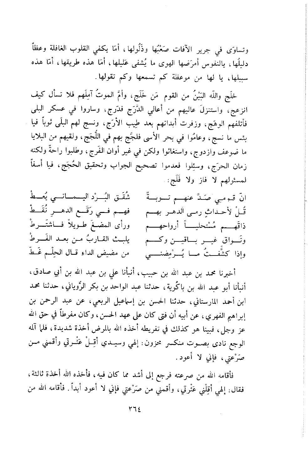 وَتَسَاوَى فِي جَرِيرِ الآفَاتِ صَعْبُهَا وَذَلُولُهَا , أَمَا يَكْفِي الْقُلُوبَ الْغَافِلَةَ وَعْظًا دَلِيلُهَا , يَا لِنُفوسٍ أمرَضها الْهَوَى مَا يَشْفَى عَلِيلُهَا , أَمَا هَذِهِ طَرِيقُهَا أَمَا هَذِهِ سَبِيلُهَا , يَا لَهَا مِنْ مَوْعِظَةٍ كَمْ تَسْمَعُهَا وَكَمْ تَقُولُهَا.