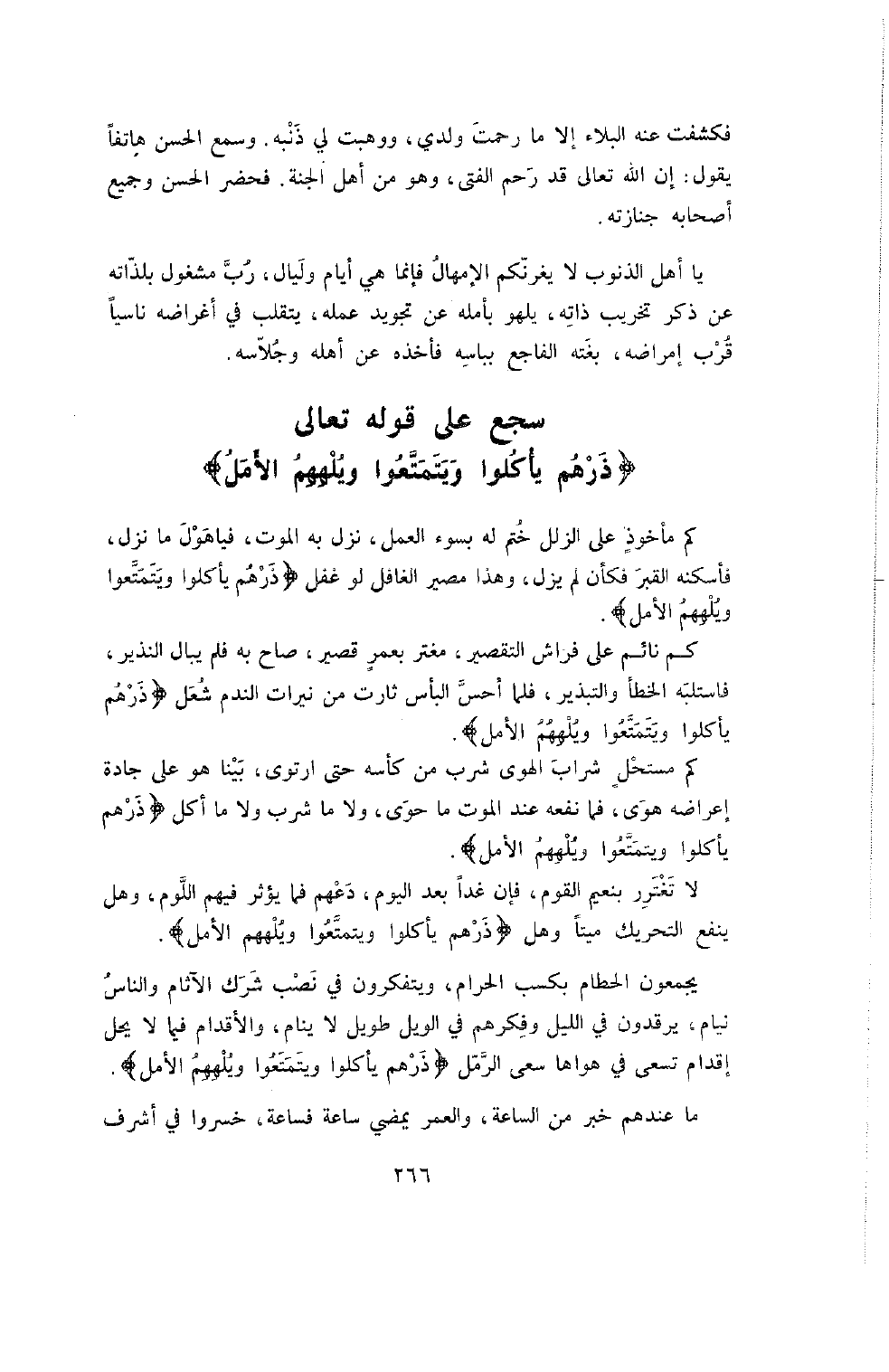 كَمْ نَائِمٍ عَلَى فِرَاشِ التَّقْصِيرِ , مُغْتَرٌّ بِعُمْرٍ قَصِيرٍ , صَاحَ بِهِ فَلَمْ يُبَالِ النَّذِيرَ , فَاسْتَلَبَهُ الْخَطَأُ وَالتَّبْذِيرُ , فَلَمَّا أَحَسَّ الْبَاسَ ثَارَتْ مِنْ نِيرَانِ النَّدَمِ شُعَلٌ {ذَرْهُمْ يَأْكُلُوا وَيَتَمَتَّعُوا وَيُلْهِهِمُ الأمل} .