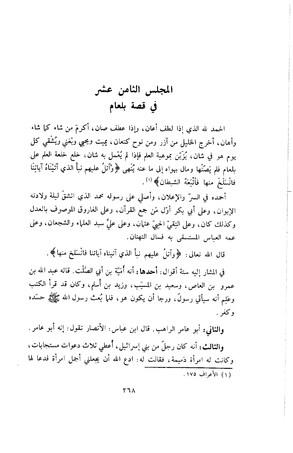 الْحَمْدُ للَّهِ الَّذِي إِذَا لَطَفَ أَعَانَ , وَإِذَا عَطَفَ صَانَ , أَكَرْمَ مَنْ شَاءَ كَمَا شَاءَ وَأَهَانَ , أَخْرَجَ الْخَلِيلَ مِنْ آزَرَ وَمِنْ نُوحٍ كَنْعَانَ , يُمِيتُ وَيُحْيِي وَيُغْنِي وَيُشْقِي كُلَّ يَوْمٍ هُوَ فِي شَأْنٍ , يَزِينُ بِمَوْهِبَةِ الْعِلْمِ فَإِذَا لَمْ يُعْمَلْ بِهِ شَانَ , خلع خلعة العلم على بلعم فَلَمْ يَصُنْهَا وَمَالَ بِهَوَاهُ إِلَى مَا عَنْهُ يُنْهَى {وَاتْلُ عَلَيْهِمْ نَبَأَ الَّذِي آتَيْنَاهُ آيَاتِنَا فانسلخ منها فأتبعه الشيطان}