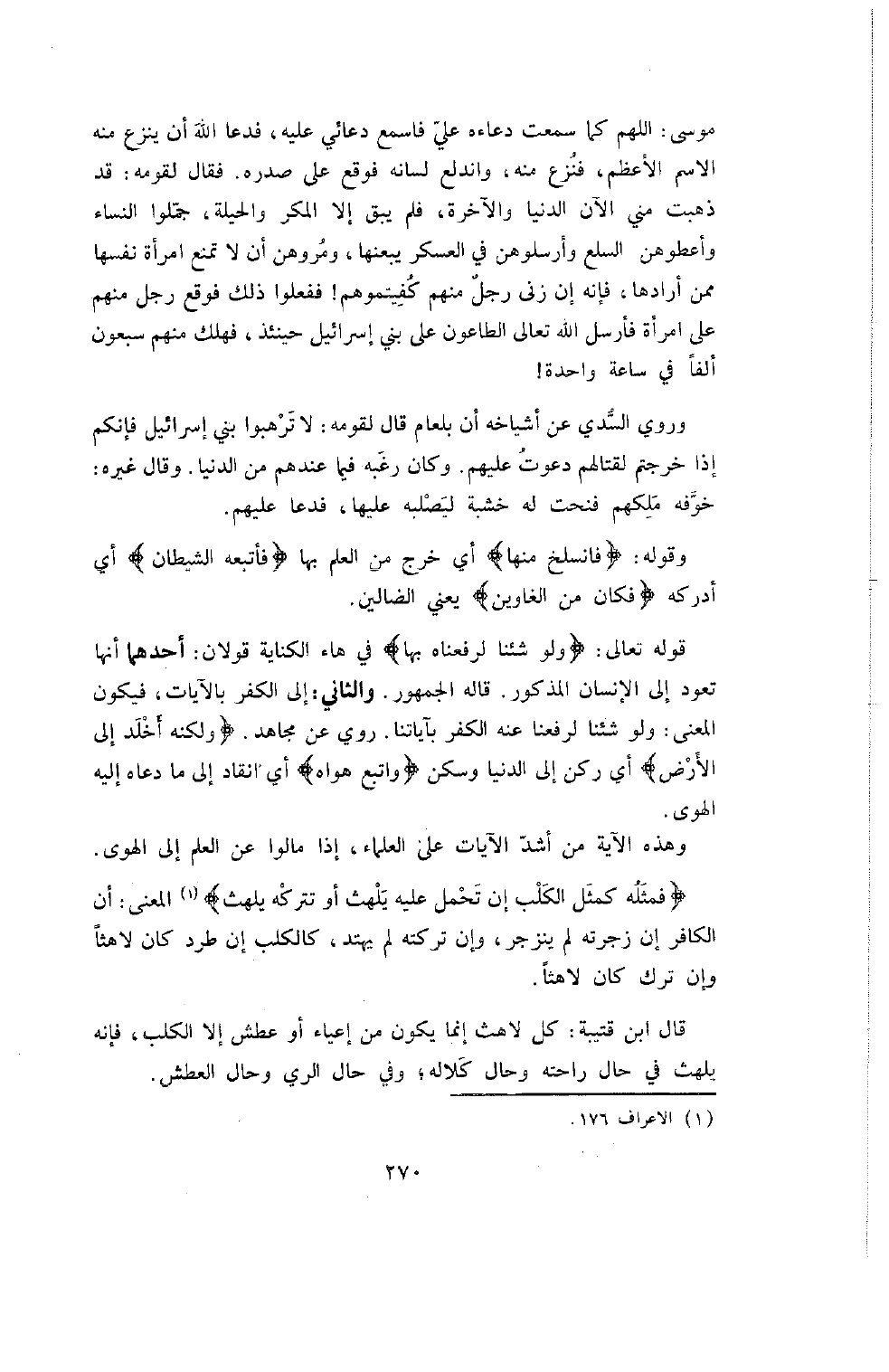 قَوْلُهُ تَعَالَى: {وَلَوْ شِئْنَا لَرَفَعْنَاهُ بها} فِي هَاءِ الْكِنَايَةِ قَوْلانِ: أَحَدُهُمَا أَنَّهَا تَعُودُ إِلَى الإِنْسَانِ الْمَذْكُورِ. قَالَهُ الْجُمْهُورُ. وَالثَّانِي: إِلَى الْكُفْرِ بِالآيَاتِ , فَيَكُونُ الْمَعْنَى: وَلَوْ شِئْنَا لَرَفَعْنَا عَنْهُ الْكُفْرَ بِآيَاتِنَا. رُوِيَ عَنْ مُجَاهِدٍ. {وَلَكِنَّهُ أخلد إلى الأرض} أَيْ رَكِنَ إِلَى الدُّنْيَا وَسَكَنَ {وَاتَّبَعَ هَوَاهُ} أَيِ انْقَادَ إِلَى مَا دَعَاهُ إِلَيْهِ الْهَوَى.