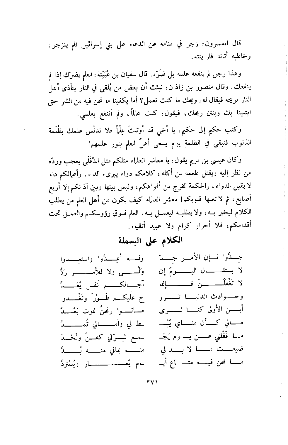 وكان عيسى بن مَرْيَمَ يَقُولُ: يَا مَعَاشِرَ الْعُلَمَاءِ مَثَلُكُمْ مَثَلُ الدِّفْلَى يُعْجِبُ وَرْدُهُ مَنْ نَظَرَ إِلَيْهِ وَيَقْتُلُ طَعْمُهُ مَنْ أَكَلَهُ , كَلامُكُمْ دَوَاءٌ يُبْرِئُ الدَّاءَ وَأَعْمَالُكُمْ دَاءٌ لا يَقْبَلُ الدَّوَاءُ , وَالْحِكْمَةُ تَخْرُجُ من أفواهكم وليس بينها وبين آذَانِكُمْ إِلا أَرْبَعُ أَصَابِعَ ثُمَّ لا تَعِيهَا قُلُوبُكُمْ! مَعْشَرَ الْعُلَمَاءِ كَيْفَ يَكُونُ مِنْ أَهْلِ الْعِلْمِ مَنْ يَطْلُبُ الْكَلامَ لِيُخْبِرَ بِهِ وَلا يَطْلُبُهُ لِيَعْمَلَ بِهِ , الْعِلْمُ فَوْقَ رُءُوسِكُمْ وَالْعَمَلُ تَحْتَ أَقْدَامِكُمْ , فَلا أَحْرَارٌ كِرَامٌ وَلا عَبِيدٌ أَتْقِيَاءُ.