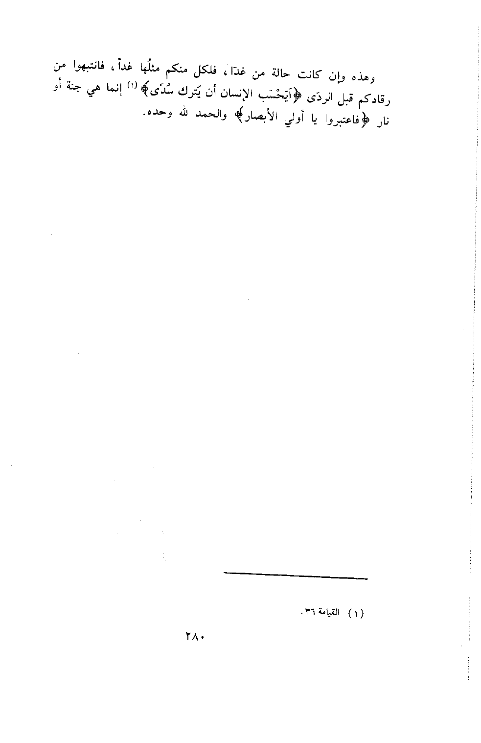 وهذه إن كَانَتْ حَالَةُ مَنْ غَدَا , فَلِكُلٍّ مِنْكُمْ مِثْلُهَا غداً , فَانْتَبِهُوا مِنْ رُقَادِكُمْ قَبْلَ الرَّدَى {أَيَحْسَبُ الإِنْسَانُ أن يترك سدى} إِنَّمَا هِيَ جَنَّةٌ أَوْ نَارٌ {فَاعْتَبِرُوا يَا أولي الأبصار} والحمد لله وحده.