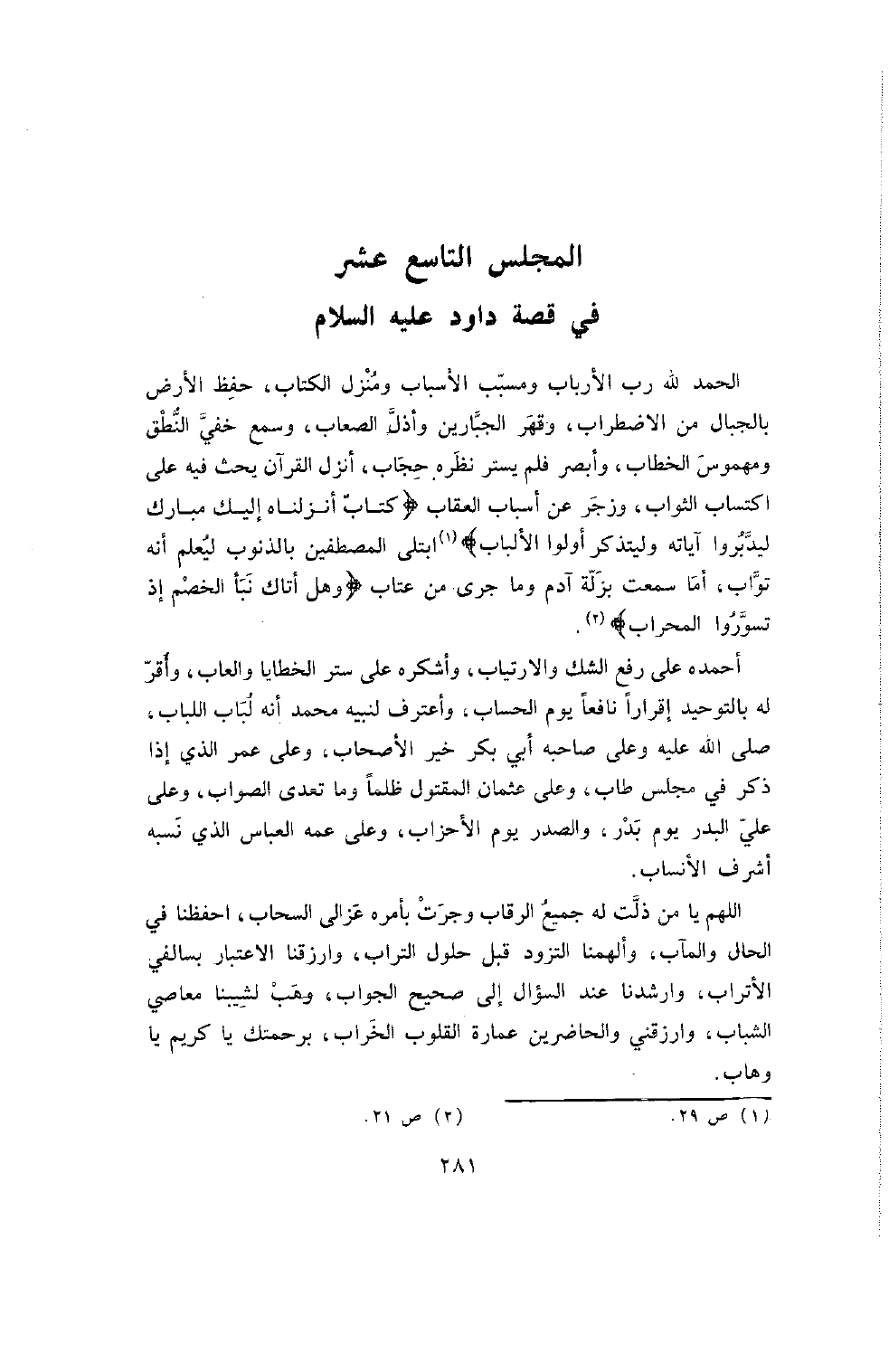 الْحَمْدُ للَّهِ رَبِّ الأَرْبَابِ وَمُسَبِّبِ الأَسْبَابِ وَمُنَزِّلِ الْكِتَابِ , حَفِظَ الأَرْضَ بِالْجِبَالِ مِنَ الاضْطِرَابِ , وَقَهَرَ الْجَبَّارِينَ وَأَذَلَّ الصِّعَابَ، وَسَمِعَ خَفِيَّ النُّطْقِ وَمَهْمُوسَ الْخِطَابِ، وَأَبْصَرَ فَلَمْ يَسْتُرْ نَظَرَهُ حِجَابٌ , أَنْزَلَ الْقُرْآنَ يَحُثُّ فِيهِ عَلَى اكْتِسَابِ الثَّوَابِ , وَزَجَرَ عَنْ أَسْبَابِ الْعِقَابِ {كِتَابٌ أَنْزَلْنَاهُ إِلَيْكَ مُبَارَكٌ لِيَدَّبَّرُوا آيَاتِهِ وليتذكروا أولوا الألباب} ابْتَلَى الْمُصْطَفِينَ بِالذُّنُوبِ لِيُعْلَمَ أَنَّهُ تَوَّابٌ , أَمَا سَمِعْتَ بِزَلَّةِ آدَمَ وَمَا جَرَى مِنْ عِتَابٍ {وَهَلْ أَتَاكَ نَبَأُ الْخَصْمِ إِذْ تَسَوَّرُوا الْمِحْرَابَ} .