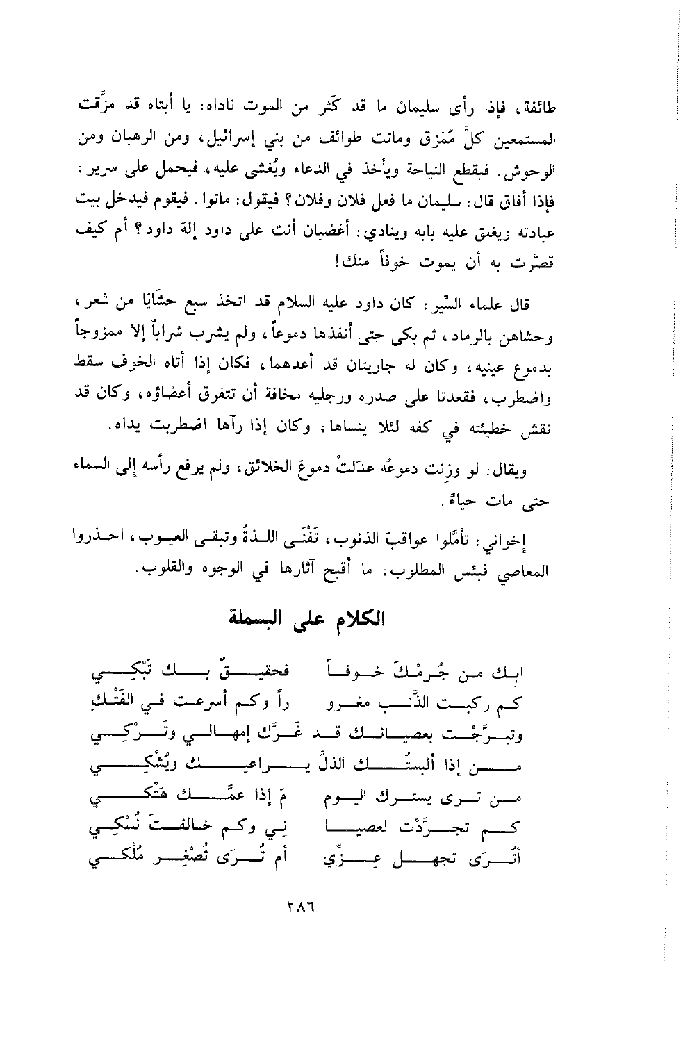 طَائِفَةٌ , فَإِذَا رَأَى سُلَيْمَانُ مَا قَدْ كَثُرَ مِنَ الْمَوْتِ نَادَاهُ: يَا أَبَتَاهُ قَدْ مَزَّقْتَ الْمُسْتَمِعِينَ كُلَّ مُمَزَّقٍ وَمَاتَتْ طَوَائِفُ مِنْ بَنِي إِسْرَائِيلَ وَمِنَ الرُّهْبَانِ وَمِنَ الْوُحُوشِ. فَيَقْطَعُ النِّيَاحَةَ وَيَأْخُذُ فِي الدُّعَاءِ وَيُغْشَى عَلَيْهِ , فَيُحْمَلُ عَلَى سَرِيرٍ فَإِذَا أَفَاقَ قَالَ سُلَيْمَانُ: مَا فَعَلَ فُلانٌ وَفُلانٌ؟ فَيَقُولُ: مَاتُوا. فَيَقُومُ فَيَدْخُلُ بَيْتَ عِبَادَتِهِ وَيُغْلِقُ عَلَيْهِ بَابَهُ وَيُنَادِي: أَغَضْبَانٌ أَنْتَ عَلَى دَاوُدَ إِلَهَ دَاوُدَ؟ أَمْ كَيْفَ قَصَرْتَ بِهِ أَنْ يَمُوتَ خَوْفًا مِنْكَ!