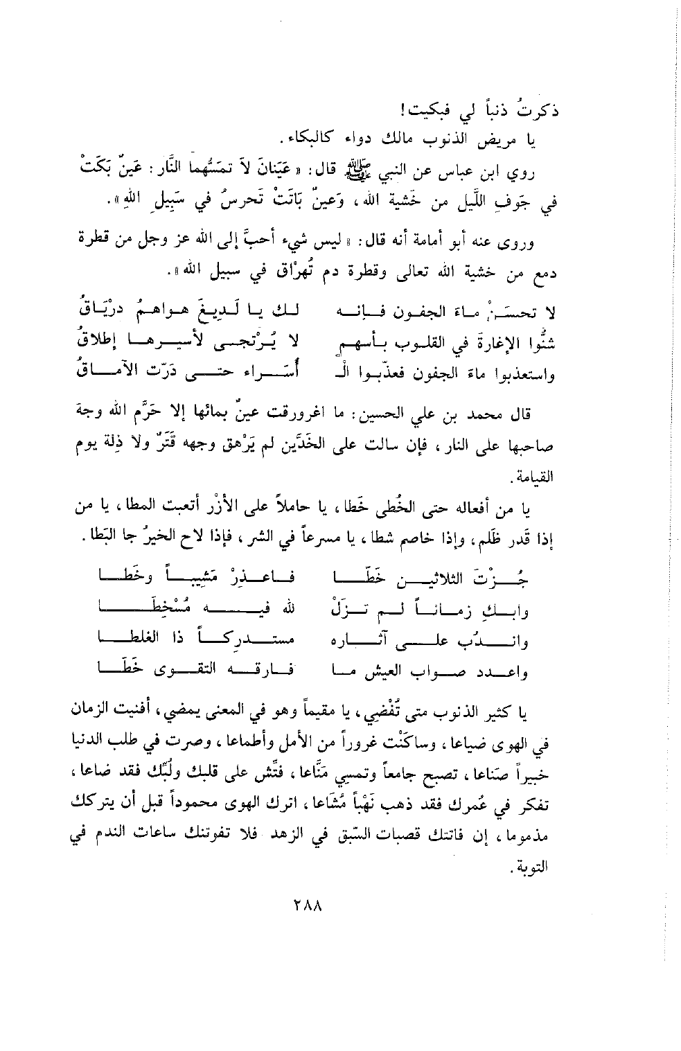 يَا كَثِيرَ الذُّنُوبِ مَتَى تُفْضِي , يَا مُقِيمًا وَهُوَ فِي الْمَعْنَى يَمْضِي , أَفْنَيْتَ الزَّمَانَ فِي الْهَوَى ضِيَاعًا , وَسَاكَنْتَ غُرُورًا مِنَ الأَمَلِ وَأَطْمَاعًا , وَصِرْتَ فِي طَلَبِ الدُّنْيَا خَبِيرًا صَنَّاعًا , تُصْبِحُ جَامِعًا وَتُمْسِي مَنَّاعًا , فَتِّشْ عَلَى قَلْبِكَ وَلُبَّكَ فَقَدْ ضَاعَا , تَفَكَّرْ فِي عُمْرِكَ فَقَدْ ذَهَبَ نَهْبًا مشاعا , اترك الهوى محمودا قبل أن يتركك مَذْمُومًا , إِنْ فَاتَتْكَ قَصَبَاتُ السَّبْقِ فِي الزُّهْدِ فلا تفوتنك ساعات النَّدَمِ فِي التَّوْبَةِ.