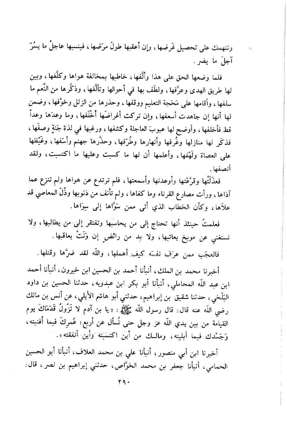 أخبرنا محمد بن الملك , أنبأنا أحمد بن الحسين ابن خَيْرُونٍ , أَنْبَأَنَا أَحْمَدُ بْنُ عَبْدِ اللَّهِ الْمَحَامِلِيُّ , أنبأنا أبو بكر ابن عَبْدُوَيْهِ , حَدَّثَنَا الْحُسَيْنُ بْنُ دَاوُدَ الْبَلْخِيُّ , حَدَّثَنَا شقيق ابن إِبْرَاهِيمَ , حَدَّثَنِي أَبُو هَاشِمٍ الأَيْلِيُّ , عَنْ أَنَسِ بْنِ مَالِكٍ رَضِيَ اللَّهُ عَنْهُ قَالَ: قَالَ رَسُولُ اللَّهِ صَلَّى اللَّهُ عَلَيْهِ وَسَلَّمَ: " يَا ابن آدَمَ لا تَزُولُ قَدَمَاكَ يَوْمَ الْقِيَامَةِ مِنْ بَيْنِ يَدِي اللَّهِ عَزَّ وَجَلَّ حَتَّى تُسْأَلَ عَنْ أَرْبَعٍ: عُمْرِكَ فِيمَا أَفْنَيْتَهُ , وَجَسَدِكَ فِيمَا أَبْلَيْتَهُ , وَمَالِكَ مِنْ أَيْنَ اكْتَسَبْتَهُ وَأَيْنَ أَنْفَقْتَهُ ".