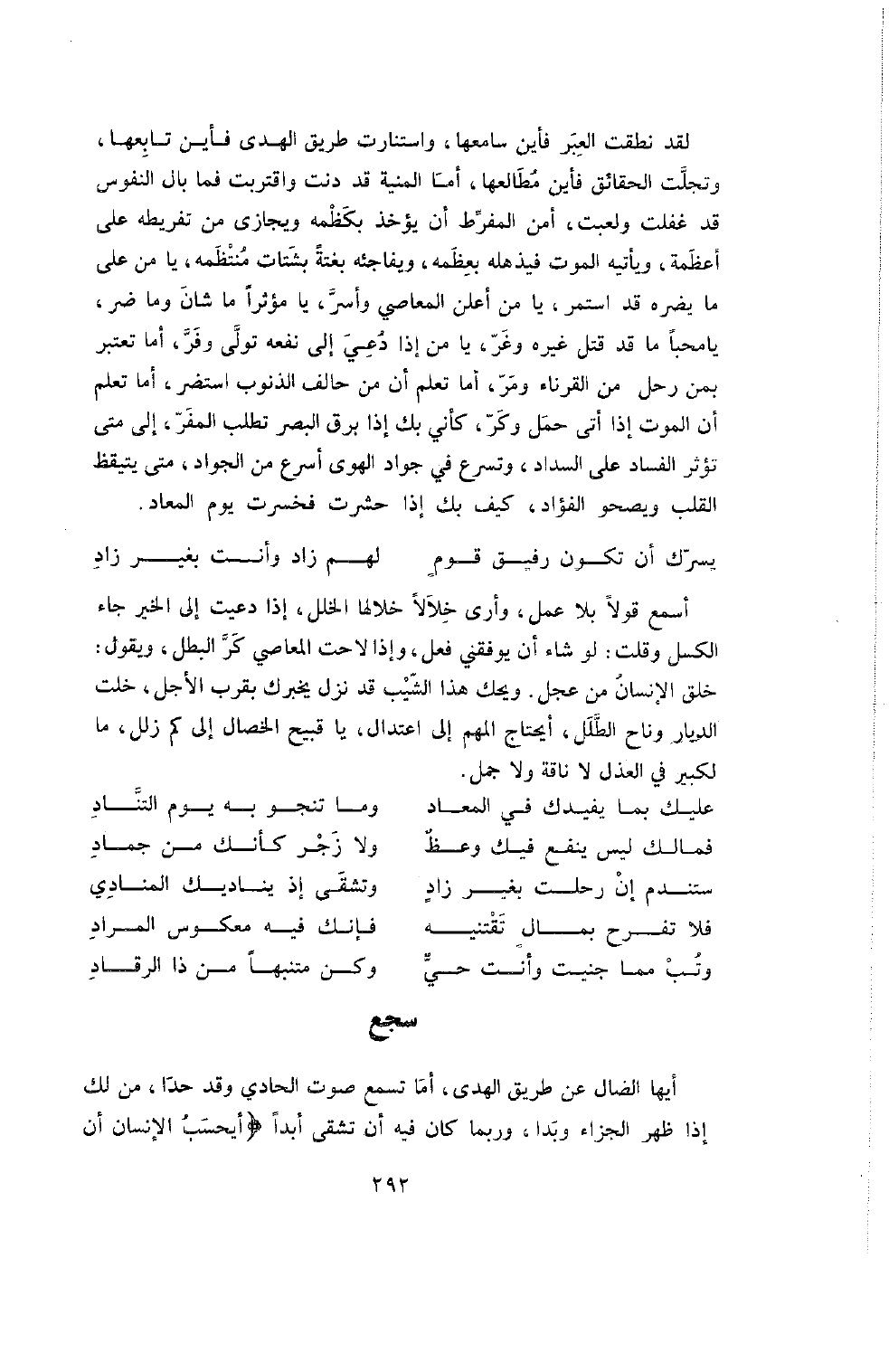 أَيُّهَا الضَّالُّ عَنْ طَرِيقِ الْهُدَى , أما تسمع صوت الحادي وَقَدْ حَدَا , مَنْ لَكَ إِذَا ظَهَرَ الْجَزَاءُ وبدا , وربما كَانَ فِيهِ أَنْ تَشْقَى أَبَدًا {أَيَحْسَبُ الإِنْسَانُ أن