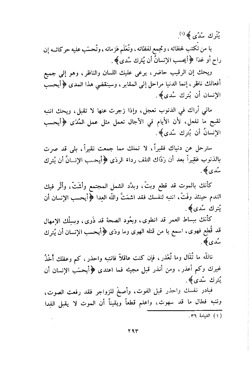 يَا مَنْ تُكْتَبُ لَحَظَاتُهُ , وَتُجْمَعُ لَفَظَاتُهُ , وَتُعْلَمُ عَزَمَاتُهُ , وَتُحْسَبُ عَلَيْهِ حَرَكَاتُهُ إِنْ رَاحَ أَوْ غدا {أيحسب الإنسان أن يترك سدى} .
