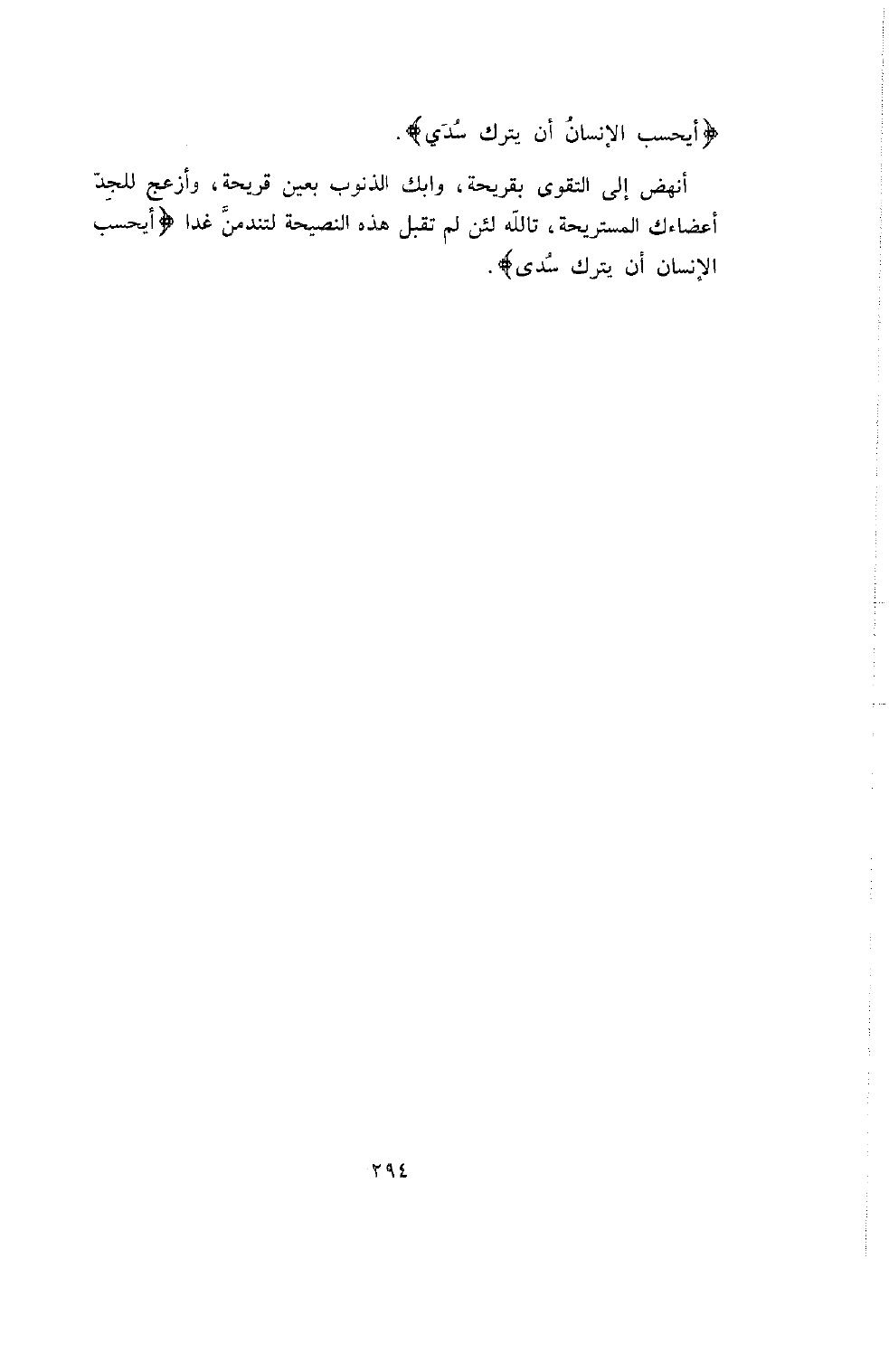 انْهَضْ إِلَى التَّقْوَى بِقَرِيحَةٍ , وَابْكِ الذُّنُوبَ بِعَيْنٍ قَرِيحَةٍ , وَأَزْعِجْ لِلْجِدِّ أَعْضَاءَكَ الْمُسْتَرِيحَةَ , تَاللَّهِ لَئِنْ لَمْ تَقْبَلْ هَذِهِ النَّصِيحَةَ لَتَنْدَمَنَّ غَدًا {أَيَحْسَبُ الإنسان أن يترك سدى} .