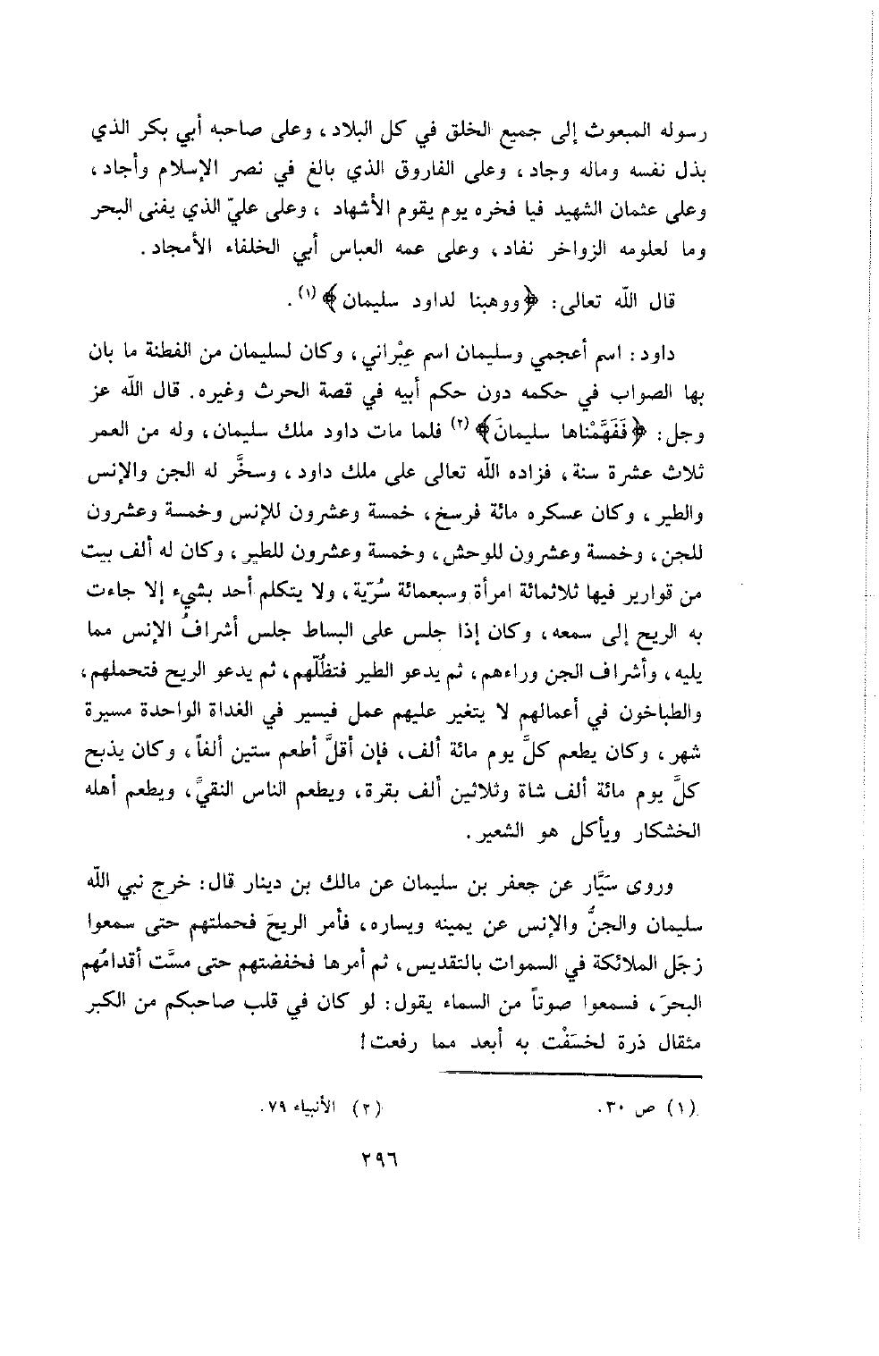 دَاوُدُ: اسْمٌ أَعْجَمِيٌّ وَسُلَيْمَانُ اسْمٌ عَبْرَانِيٌّ , وَكَانَ لِسُلَيْمَانَ مِنَ الْفِطْنَةِ مَا بَانَ بِهَا الصَّوَابُ فِي حُكْمِهِ دُونَ حُكْمِ أَبِيهِ فِي قِصَّةِ الحرث وغيره. قال الله عز وجر: {ففهمناها سليمان} فَلَمَّا مَاتَ دَاوُدُ مَلَكَ سُلَيْمَانُ وَلَهُ مِنَ الْعُمْرِ ثَلاثَ عَشْرَةَ سَنَةً , فَزَادَهُ اللَّهُ تَعَالَى عَلَى مُلْكِ دَاوُدَ , وَسَخَّرَ لَهُ الْجِنَّ وَالإِنْسَ وَالطَّيْرَ وَكَانَ عَسْكَرُهُ مِائَةَ فَرْسَخٍ , خَمْسَةٌ وَعِشْرُونَ لِلإِنْسِ وَخَمْسَةٌ وَعِشْرُونَ لِلْجِنِّ , وَخَمْسَةٌ وَعِشْرُونَ لِلْوَحْشِ وَخَمْسَةٌ وَعِشْرُونَ لِلطَّيْرِ , وَكَانَ لَهُ أَلْفُ بَيْتٍ من قوارير فيها ثلاثمائة امرأة وسبعمائة سَرِيَّةٍ , وَلا يَتَكَلَّمُ أَحَدٌ بِشَيْءٍ إِلا جَاءَتْ بِهِ الرِّيحُ إِلَى سَمْعِهِ , وَكَانَ إِذَا جَلَسَ عَلَى الْبِسَاطِ جَلَسَ أَشْرَافُ الإِنْسِ مِمَّا يَلِيهِ وَأَشْرَافُ الْجِنِّ وَرَاءَهُمْ , ثُمَّ يَدْعُو الطَّيْرَ فَتُظِلُّهُمْ , ثُمَّ يَدْعُو الرِّيحَ فَتَحْمِلُهُمْ، وَالطَّبَّاخُونَ فِي أَعْمَالِهِمْ لا يَتَغَيَّرُ عَلَيْهِمْ عَمَلٌ فَيَسِيرُ فِي الْغَدَاةِ الْوَاحِدَةِ مَسِيرَةَ شَهْرٍ , وَكَانَ يُطْعِمُ كُلَّ يَوْمٍ مِائَةَ أَلْفٍ , فَإِنْ أَقَلَّ أَطْعَمَ سِتِّينَ أَلْفًا , وَكَانَ يَذْبَحُ كُلَّ يَوْمٍ مِائَةَ أَلْفِ شَاةٍ وَثَلاثِينَ أَلْفَ بَقَرَةٍ , وَيُطْعِمُ النَّاسَ النَّقِيَّ وَيُطْعِمُ أَهْلَهُ الْخُشْكَارَ وَيَأْكُلُ هُوَ الشَّعِيرَ.