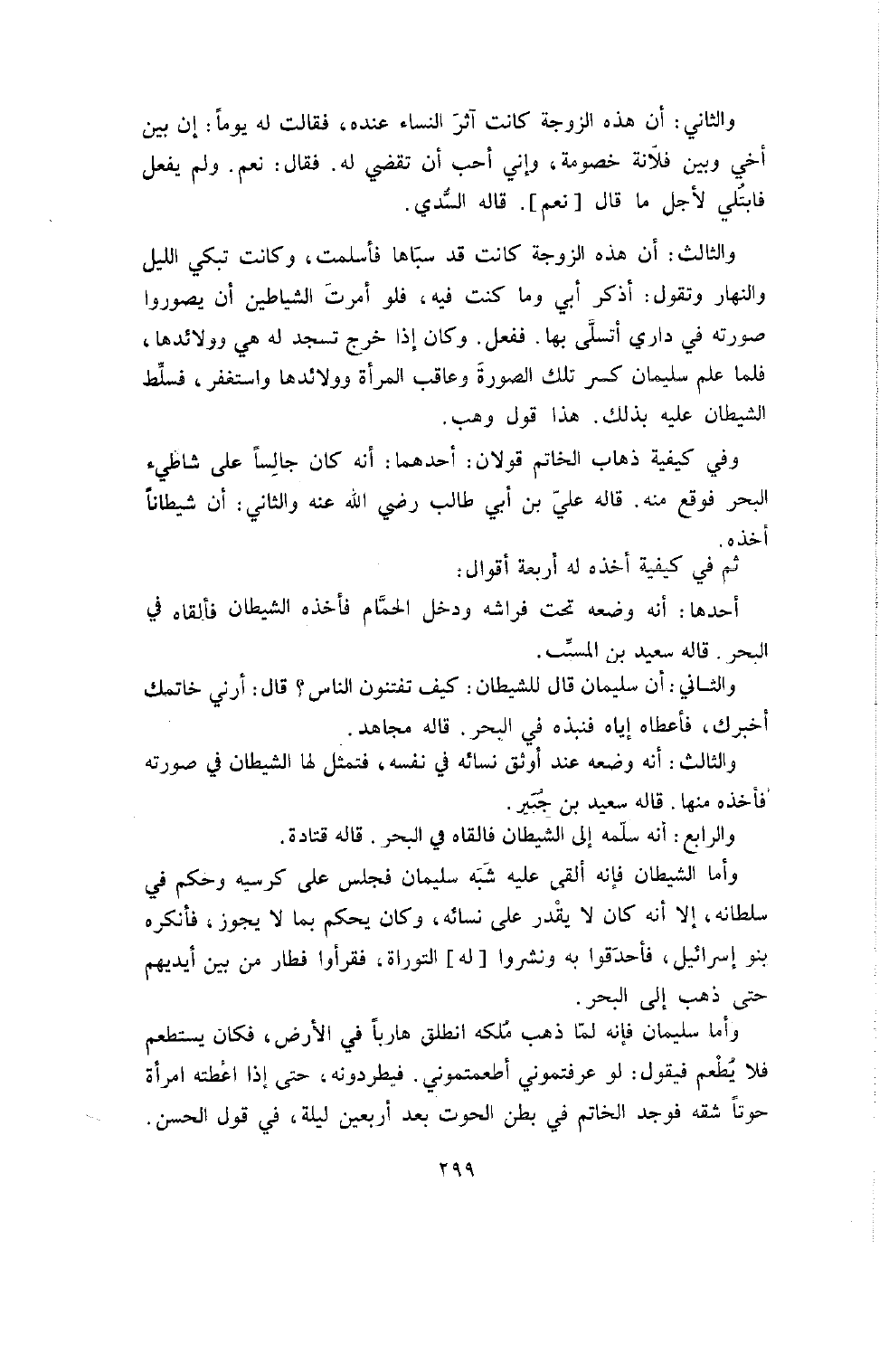 وَالثَّالِثُ: أَنَّ هَذِهِ الزَّوْجَةَ كَانَتْ قَدْ سَبَاهَا فَأَسْلَمَتْ , وَكَانَتْ تَبْكِي اللَّيْلَ وَالنَّهَارَ وَتَقُولُ: أَذْكُرُ أَبِي وَمَا كُنْتُ فِيهِ , فَلَوْ أَمَرْتَ الشَّيَاطِينَ أَنْ يُصَوِّرُوا صُورَتَهُ فِي دَارِي أَتَسَلَّى بِهَا. فَفَعَلَ. وَكَانَ إذا خَرَجَ تَسْجُدُ لَهُ هِيَ وَوَلائِدُهَا , فَلَمَّا عَلِمَ سُلَيْمَانُ كَسَرَ تِلْكَ